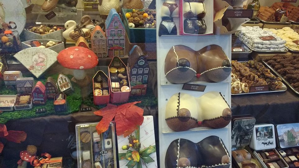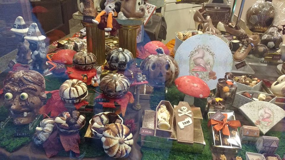 Nasza wizyta w Belgii odbyła się przed Halloween, więc wystawy sklepowe były odpowiednio przystrojone. Czekoladowe dekoracje zmieniają się tam zależnie od świąt i pór roku. I to jest najfajniejsze, bo jest co oglądać 🙂