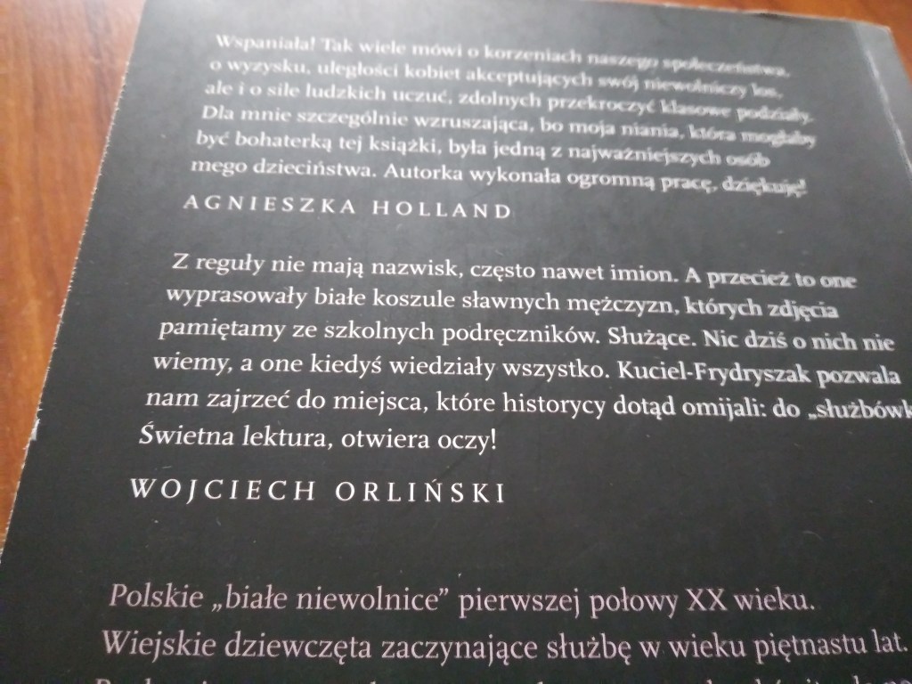 Wiedziałam, że kiedyś służba w domach była na porządku dziennym. Ale myślałam, że tylko w bardzo bogatych domach…. A ta książka opowiada o polskich „białych niewolnicach”, zapomnianych kobietach z najniższego szczebla hierarchii służby domowej, żyjących w przedwojennej Polsce. Niedoceniane, upokarzane, wykorzystywane. Wiejskie dziewczęta, które zaczynały pracę często w wieku 15 lat. Bez prawa urlopu, wypoczynku. Książka opisuje ich życie, co robią, gdy mają wychodne, jak pracują, ile zarabiają, w jakich skandalicznych warunkach mieszkają, jak są traktowane przez chlebodawców, nierzadko molestowane…