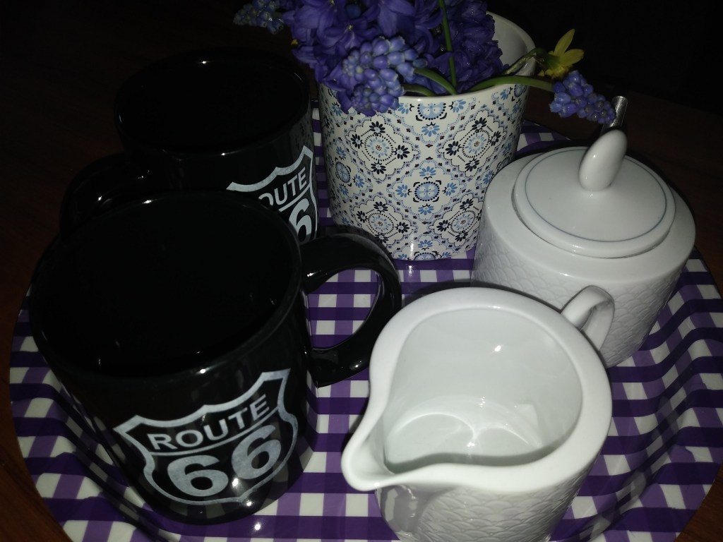 Wygrzebałam też 2 małe doniczki o ciekawym wzorze. Jedna stoi pusta, a druga robi za tymczasowy wazon 🙂 Do tego 2 kubki z logo Route 66. A na punkcie kubków mam bzika 🙂 Zawsze przytargam do domu jakiś kubełek. O kubkach, jakie można w kringloopach znaleźć, napiszę osobny post. Spodobał mi się także mały komplecik: cukiernica+ dzbanuszek na mleko. Prosty wzór, a la rybie łuski.