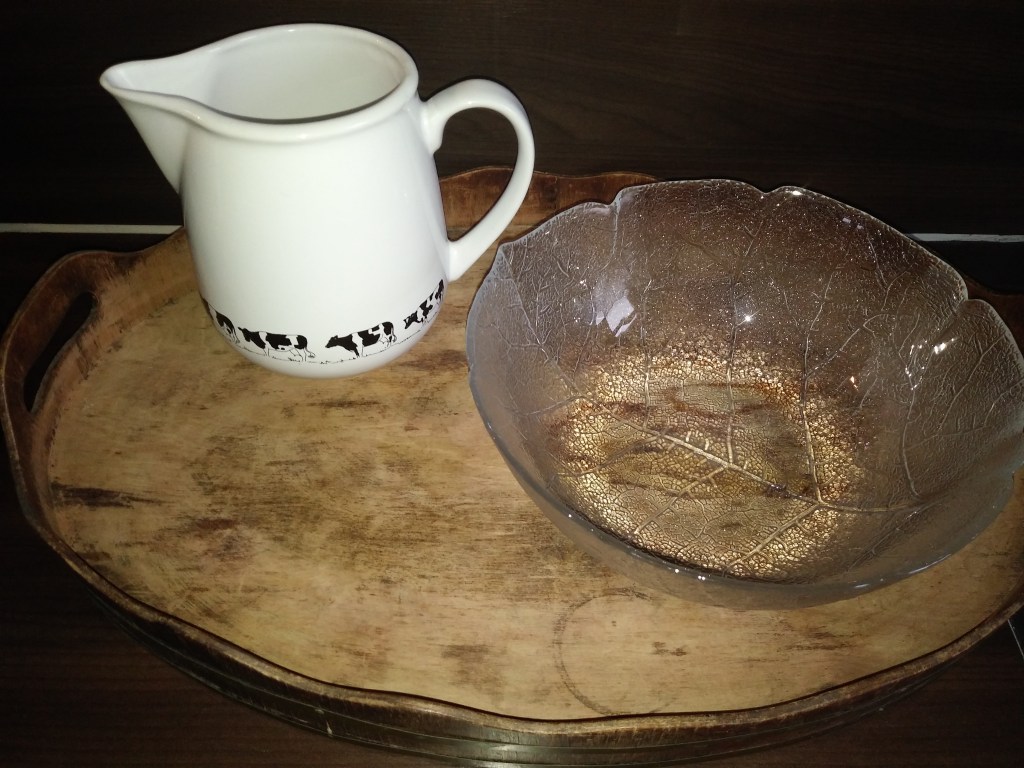 Uroczy dzbanek w krowy i salaterka w liście kapusty. Takie dzbanki robią teraz furorę. I nie są używane do mleka. Zauważyłam, że ludzie traktują je jako wazony, lub trzymają w nich łyżki. Ja do swojego wsadziłam drewniane łychy do mieszania w garach i ładnie się to prezentuje. Salaterek nigdy nie za mało. Miski służą do przygotowania np sałatki, a salaterka do podania. Ta akurat wygląda świetnie 🙂