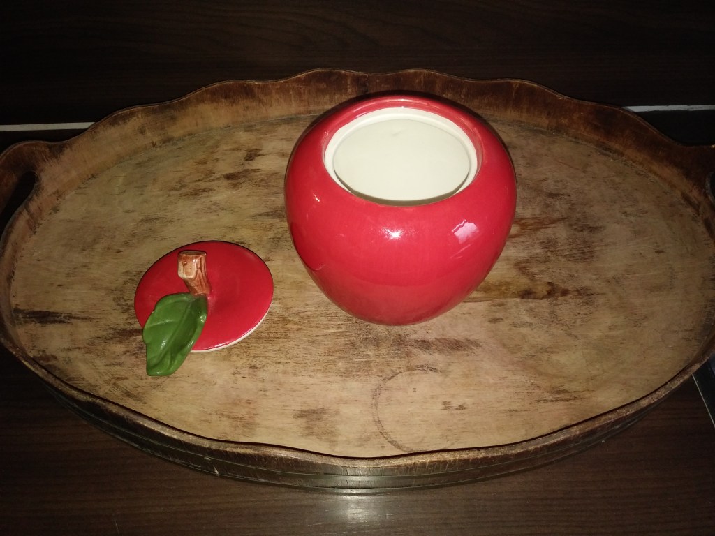 Jabłko szklane- pojemnik. Stoi w kuchni na okapie i jest fajną ozdobą. Trzymam w nim np gumki recepturki, które nie raz były mi akurat w kuchni potrzebne. Jabłko kosztowało chyba 1 euro. Zwróćcie uwagę na tacę. Nie mam jeszcze na nią pomysłu, ale musiałam ją mieć, mimo, że nie jest w extra stanie. Ma odbarwienia, plamy i obtarcia. Ale przypomina mi beczki, które można znaleźć na statku. A to, co kojarzy mi się z morzem, statkami, itp, to dla mnie jest skarbem 🙂 Wydaje mi się, że taca świetnie się nadaje do salonu: postawić na niej wazon z kwiatami, parę świec i voila! Ozdoba gotowa 🙂