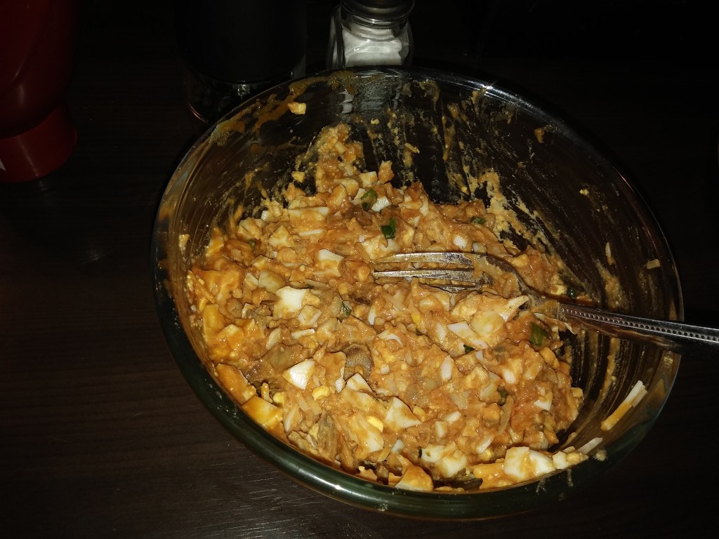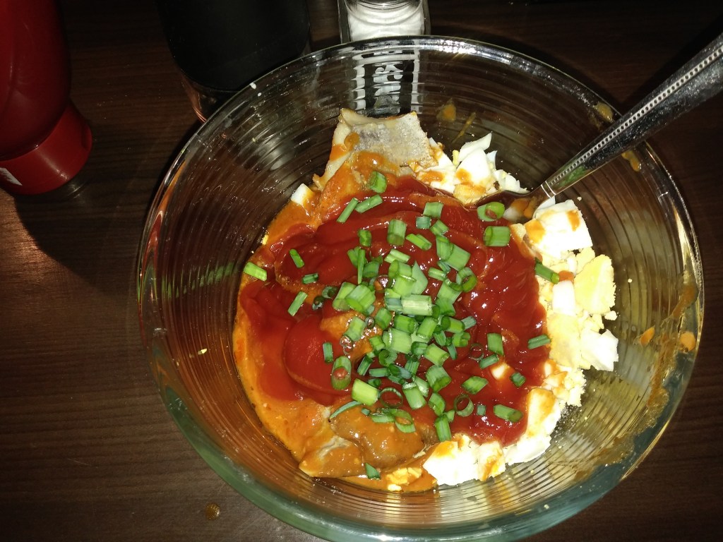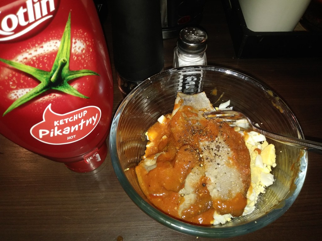 Filety śledziowe ze zdjęcia pochodzą oczywiście z polskiego sklepu, ale te holenderskie też są w sumie smaczne. Zamiast śledzia, można użyć makreli w pomidorach. Jajka (4 -5 szt) gotuję na twardo. Żeby szybciej i łatwiej się obierały, warto dodać do wody trochę zwykłego octu 🙂 Po ugotowaniu siekam w drobną kostkę, solę, pieprzę. Potem dorzucam rybę i ketchup- taką ilość ketchupu, żeby nie było za suche i zbyt lejące.