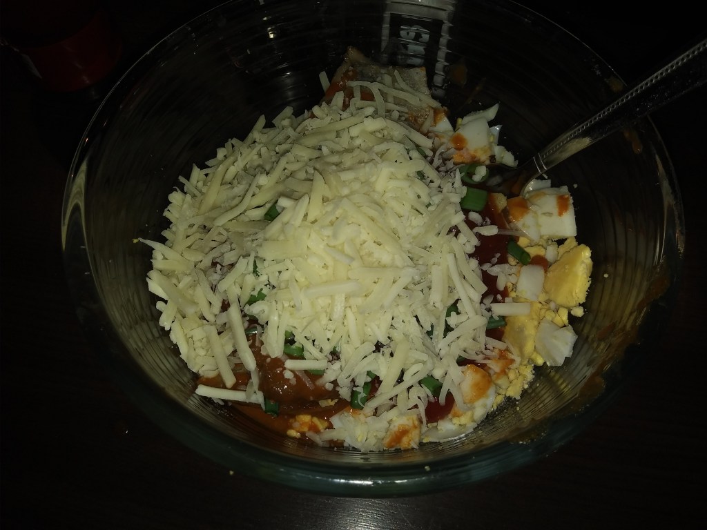 I teraz mała modyfikacja, bo ja zamiast cebuli dodaję szczypiorek, który hoduję na parapecie w kuchni. Ja po prostu wolę szczypiorek 🙂 Tnę nożyczkami, bo to zawsze szybciej i prościej. Oprócz zieleniny daję starty żółty ser i „bełtam” to wszystko elegancko widelcem 🙂