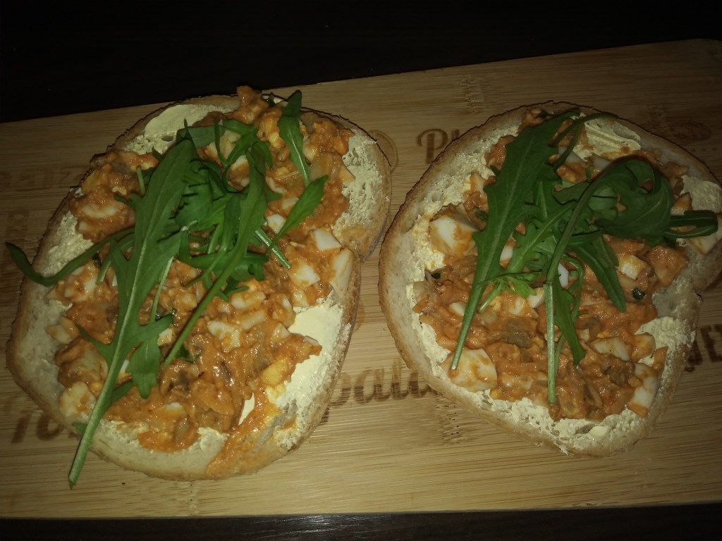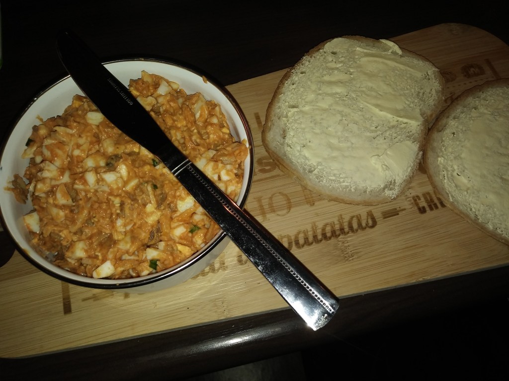 Czasem jest tak, że już nie wiem, co zjeść. Unikam holenderskie wędliny, ale i czasem w polskim sklepie nie ma zbyt dużego wyboru… Dlatego zawsze mam w domu jajka i rybę w pomidorach 🙂 I robię z nich bardzo smaczną pastę do kanapek. Kto lubi ryby i jajka, temu posmakuje. Do tego ketchup- nasz Kotlin i posiekana cebula. Ja trochę zmodyfikowałam przepis, który polecam!