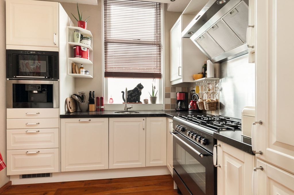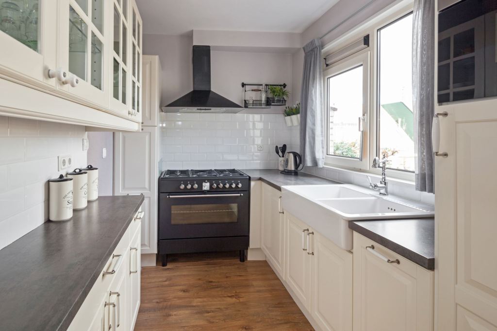 Kuchnia niewielka, ale przyjemna. Meble nowoczesne. Znajdziemy czerwone akcenty, kota na parapecie i dwa plecione koszyczki, wiszące obok kuchenki. Podłoga drewniana 🙂