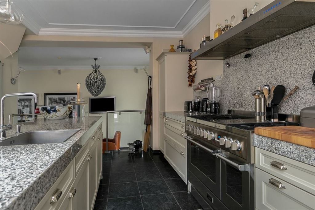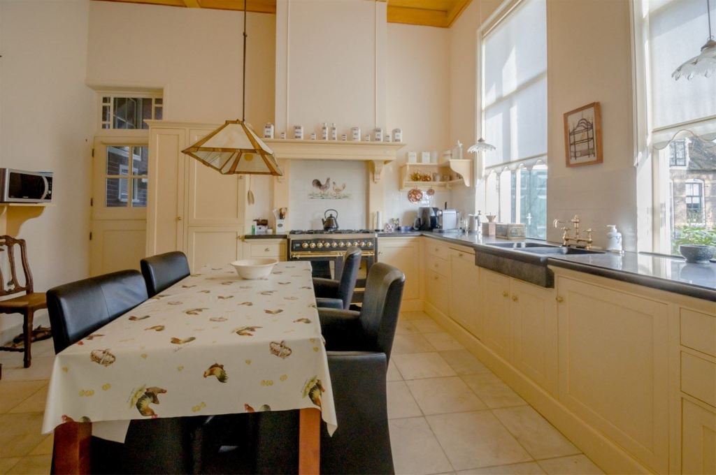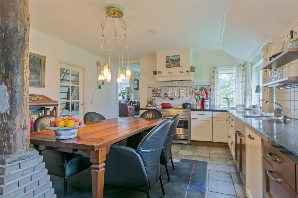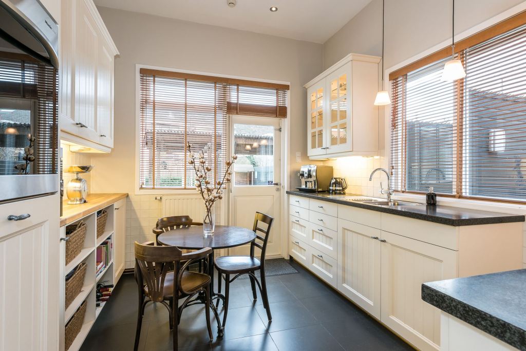 Ta kuchnia nie jest ogromna, ale bardzo przytulna. Ponownie widzimy nieduży stół w kolorze drewna, ze świetnymi krzesłami. Na nim stoi skromny wazon z kwiatami (podejrzewam) magnolii. Holendrzy uwielbiają kwiaty w domu i niemal w każdej kuchni zobaczymy wazony ze świeżymi kwiatami 🙂 W oczy rzucają się także plecione koszyki i dwie nieduże lampy wiszące nad zlewem, które dają ciepłe światło.