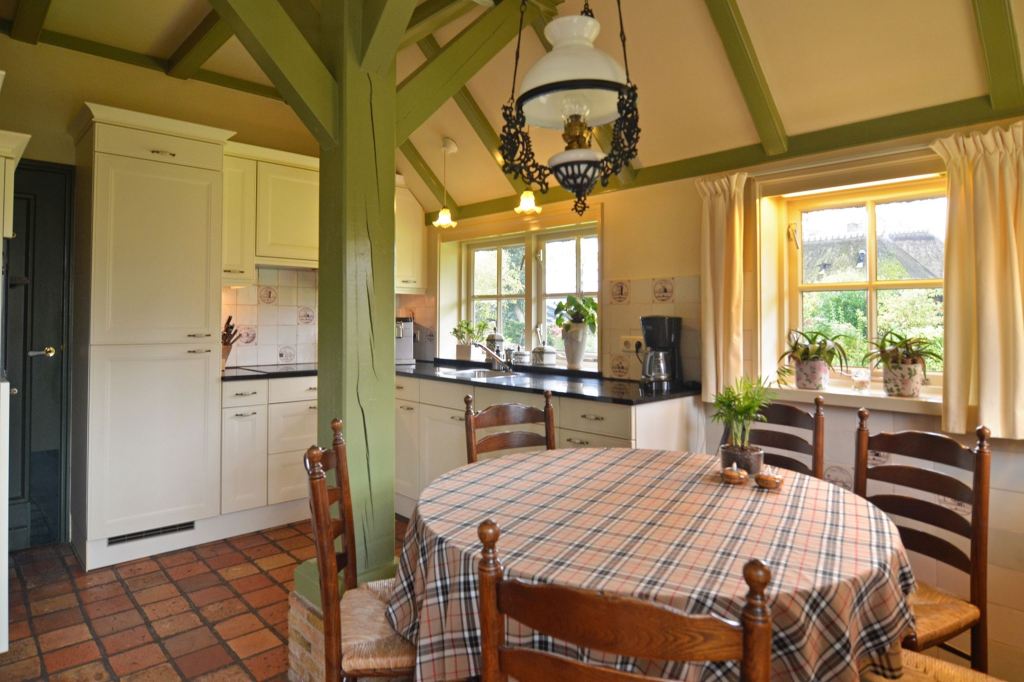 Kuchnia spora, bo zmieścił się w niej wielki drewniany stół (z koszmarnymi fotelami). Meble nowoczesne, połączone ze stylowo zabudowanym okapem, na którym stoją bibeloty. W oknie kolorowa zasłonka. Na podłodze dywan. Obok kuchenki gazowej stoi coś, co zauważyłam od razu: kanka na mleko! Świetny gadżet do kuchni. Holendrzy wstawiają do niej kwiaty, lub łychy kuchenne 🙂