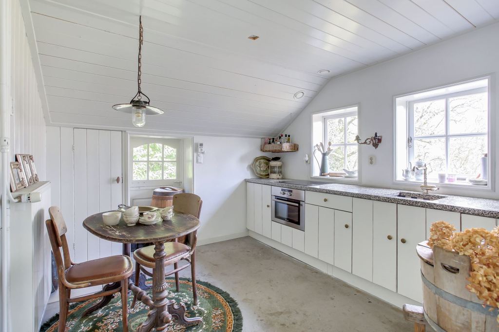 Biel, biel i drewno. Ta kuchnia jest mega skromna, jakby złożona z samych rzeczy, których ktoś się pozbył: stół z przetartym blatem, stare krzesła, lichtarz wiszący między oknami… Znowu widzę na parapecie cudeńko: emaliowany dzbanek z łychami 🙂 No i te drewniane beki… 🙂