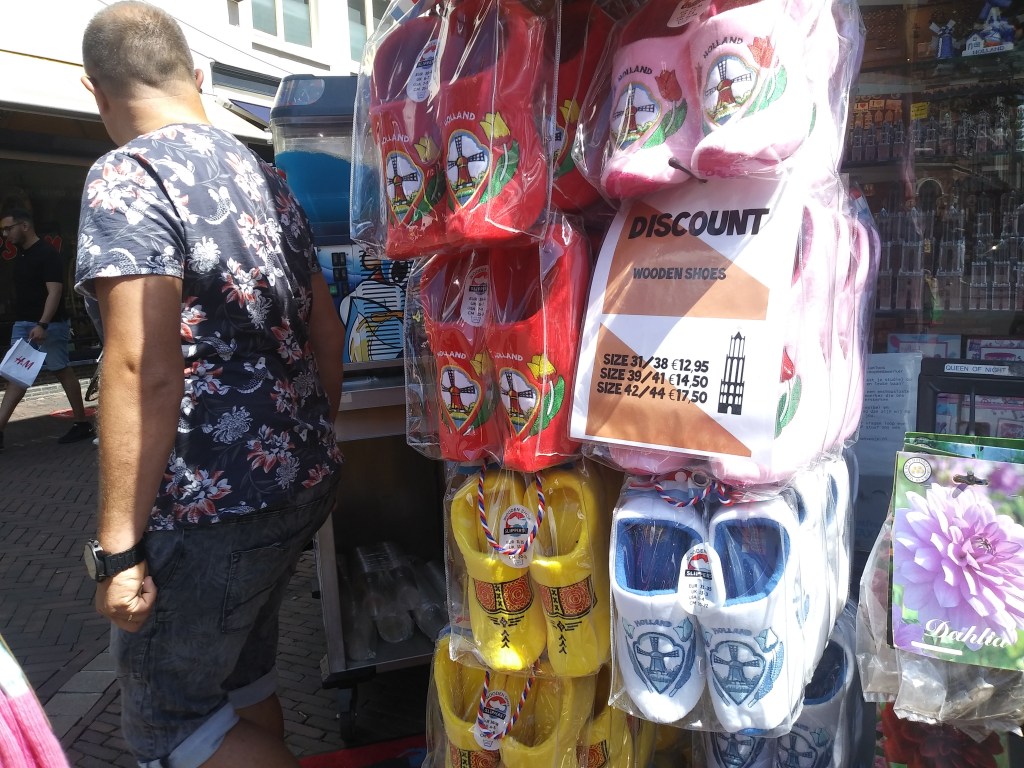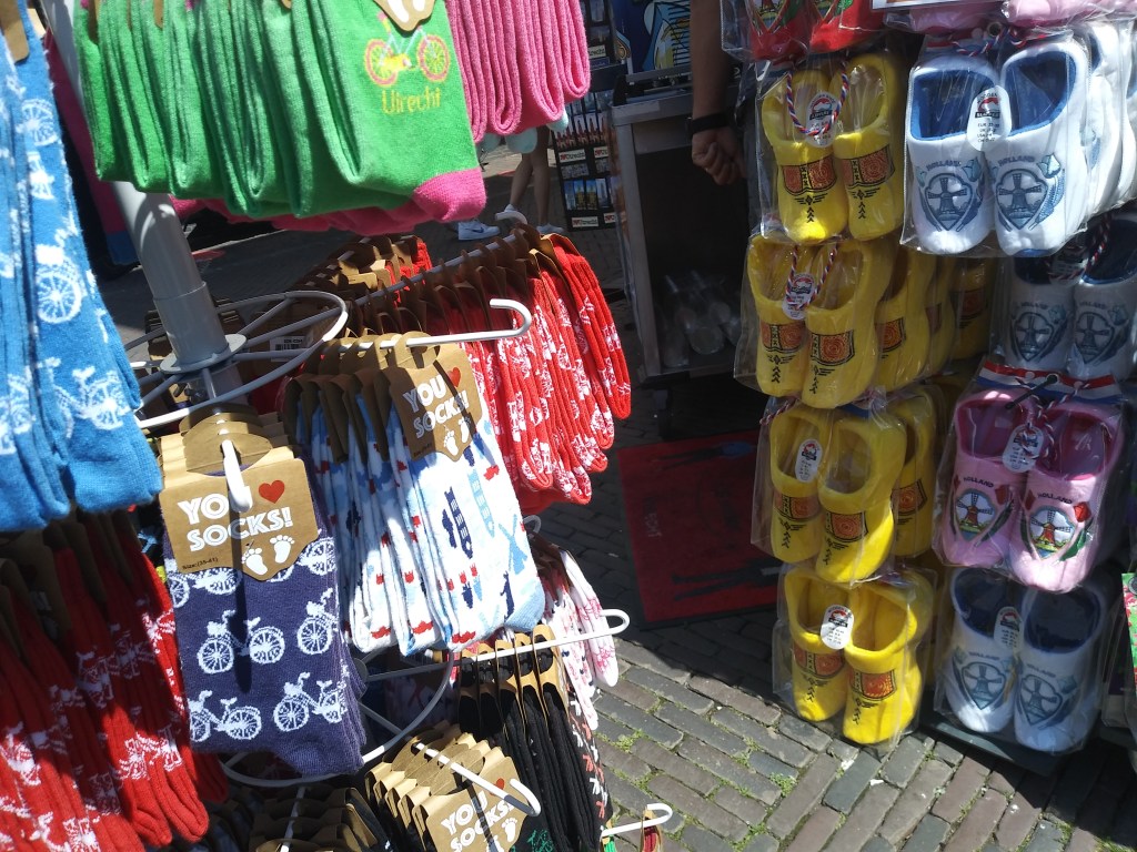 Skarpety i saboty– jak widać wszystkie w fantastycznych kolorach. Ja za skarpetami akurat nie jestem, ale saboty, czyli słynne drewniane buty są ok 🙂 Z tym, że te tutaj nie są z drewna a z pluszowego materiału. Takie typowe bambosze do chodzenia po domu. No i te holenderskie symbole… 🙂