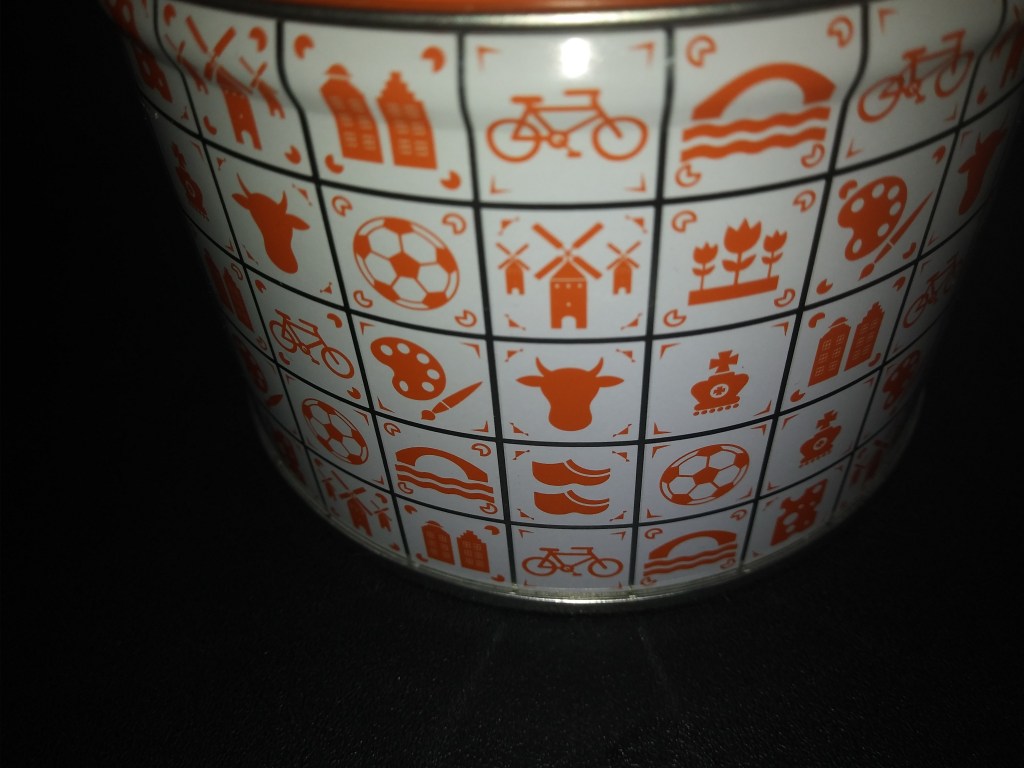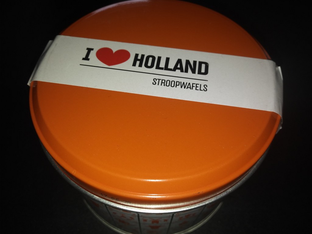 Stroopwafels, czyli słynne holenderskie ciastka z karmelem. Z tym, że nie te kupione w markecie zapakowane w folię. Proponuję poszukać takich w ozdobnej puszce, jak np na zdjęciu wyżej. Puszka w kolorze pomarańczowym, czyli w kolorze Holandii. Do tego ta piękna grafika: rowery, saboty, wiatraki, krowa…