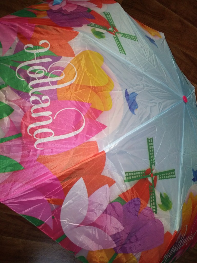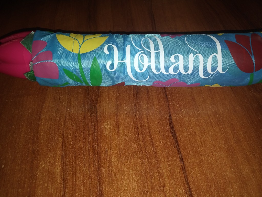 Parasolka w tulipany i wiatraki z napisem Holland. Bardzo kolorowa, do tego posiada rączkę w kształcie tulipana. Nie jest może zrobiona z super materiału, ale do zdjęć i małego deszczu pasuje jak ulał 🙂