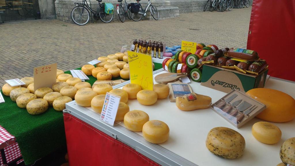 Sery- wiadomo, Holandia słynie z serów i to nie byle jakich. Wiele rodzajów znajdziemy w marketach. Ale to nie to samo, co ser kupiony w Goudzie, czy Edam. W tych miastach organizowane są prawdziwe targi serowe, gdzie można podziwiać i kupić wielkie okrągłe sery. Oprócz tego, trafić można na jarmarki (ten na zdjęciu powyżej był w Goudzie), gdzie kupimy lokalny przysmak. Z braku laku, w większych centrach handlowych, spotkać można serowe sklepy, gdzie zaopatrzymy się w żółte trójkąty 🙂