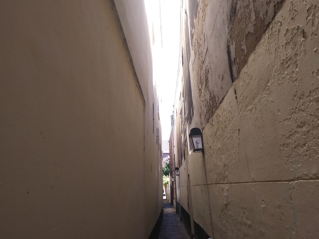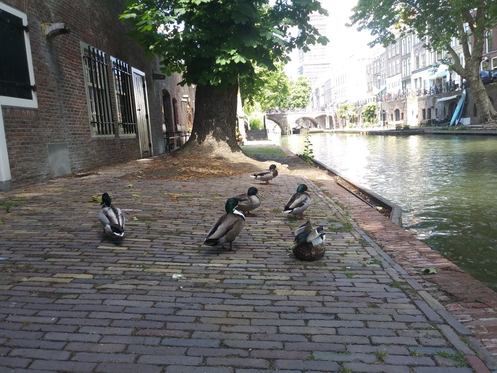 Kaczki w ogóle się nie bały. Przyzwyczajone do turystów. Staraliśmy się mimo to, przejść możliwie jak najdalej od nich. Powiedziałam nawet do nich grzecznie: „Przepraszam kaczki, że przeszkadzamy, ale musimy przejść” 😀 Nie wiem, czy zrozumiały, bo to jakby nie patrzeć, holenderskie ptaki, ale odpowiedziały: „Kwa, kwa, kwa” 😀 Na zdjęciu niżej znajduje się chyba najwęższa uliczka w Utrechcie! No chyba, że jeszcze gdzieś jakieś takie są… Po obu stronach budynków, znajdują się okna i sąsiad sąsiadowi może elegancko zajrzeć do chałupy!