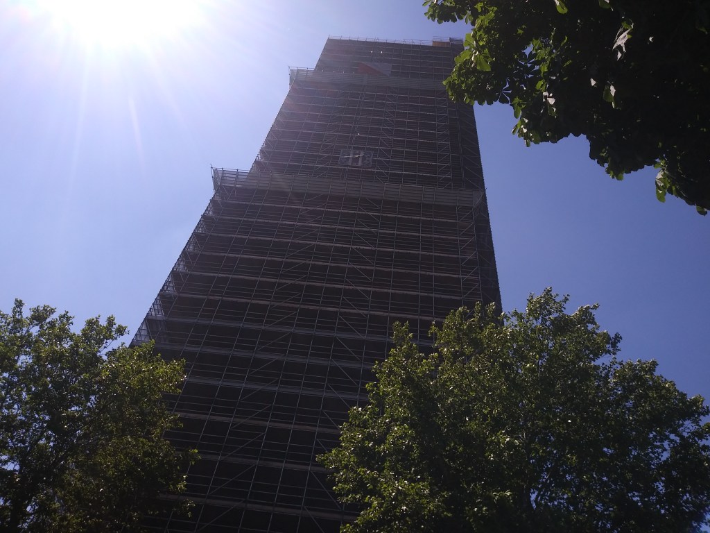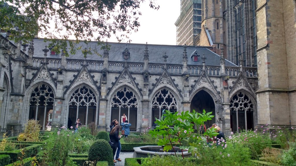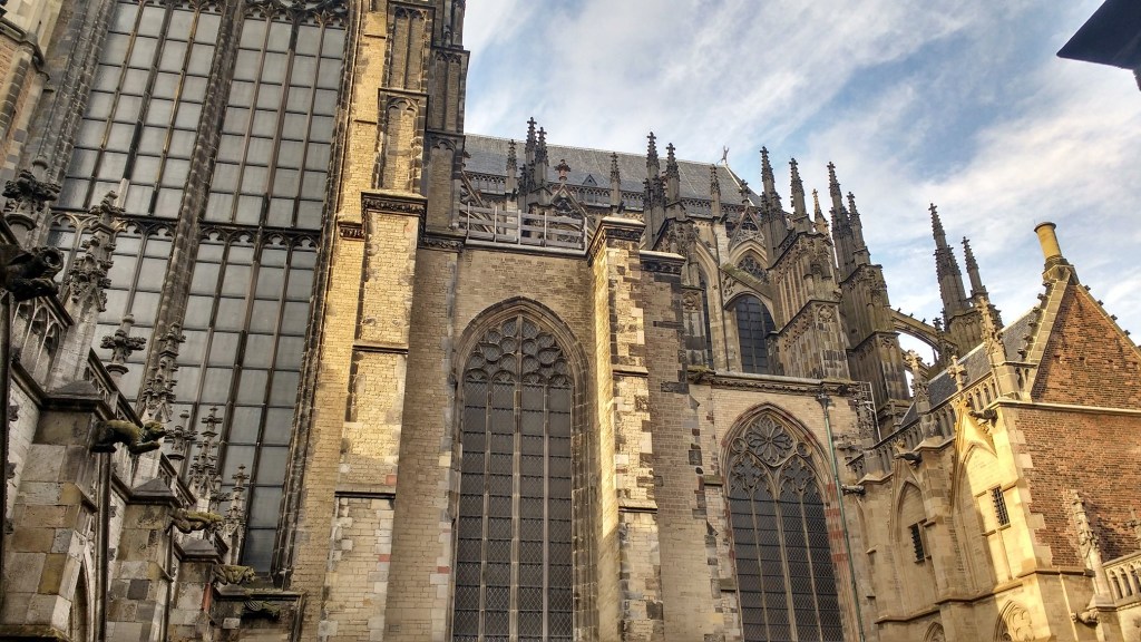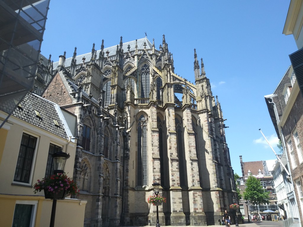 Dotarliśmy po ok 10 minutach pod Katedrę Świętego Marcina. To druga nasza wizyta tam. Pierwszy raz byliśmy w zeszłym roku. Pojechaliśmy na LegoWorld i stwierdziliśmy, że zobaczymy też katedrę. Budynek robi oszałamiające wrażenie. Nawiązuje stylem do gotyku francuskiego. Jego budowa rozpoczęła się w 1254 roku i trwała do XVI wieku. W 1572 r w wyniku nadchodzącej fali reformacji dokonano wielu wandalizmów i duża liczba ornamentów wewnętrznych i zewnętrznych została zniszczona. Z ogromnej katedry zachowała się tylko część wschodnia, w pobliżu wieży Domotoren. W 1674 r w czasie burzy zawaliła się nieukończona nawa, dlatego dziś wieża stoi kilkadziesiąt metrów od reszty katedry. Wieża ma 112m i podobno jest to najwyższa kościelna dzwonnica Holandii. Na wieżę do tej pory nie weszliśmy z braku czasu. W tej chwili wokoło wieży rozstawione są rusztowania, ale wejść na nią można. Tylko z przewodnikiem! Wcześniej trzeba zrobić rezerwację, gdyż ustalone są godziny wejścia, np 13:30. Na przeciwko znajduje się informacja turystyczna. Informację na ten temat można znaleźć też w internecie. Jeżeli chodzi o katedrę, to niestety była zamknięta dla zwiedzających (wirus:/ ). Udało nam się zobaczyć dziedziniec z ogrodem w zeszlym roku. Katedrę można zwiedzać za darmo.