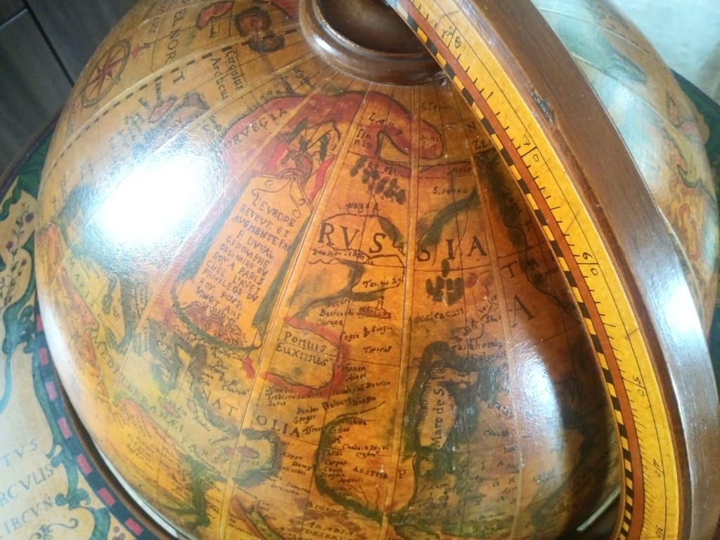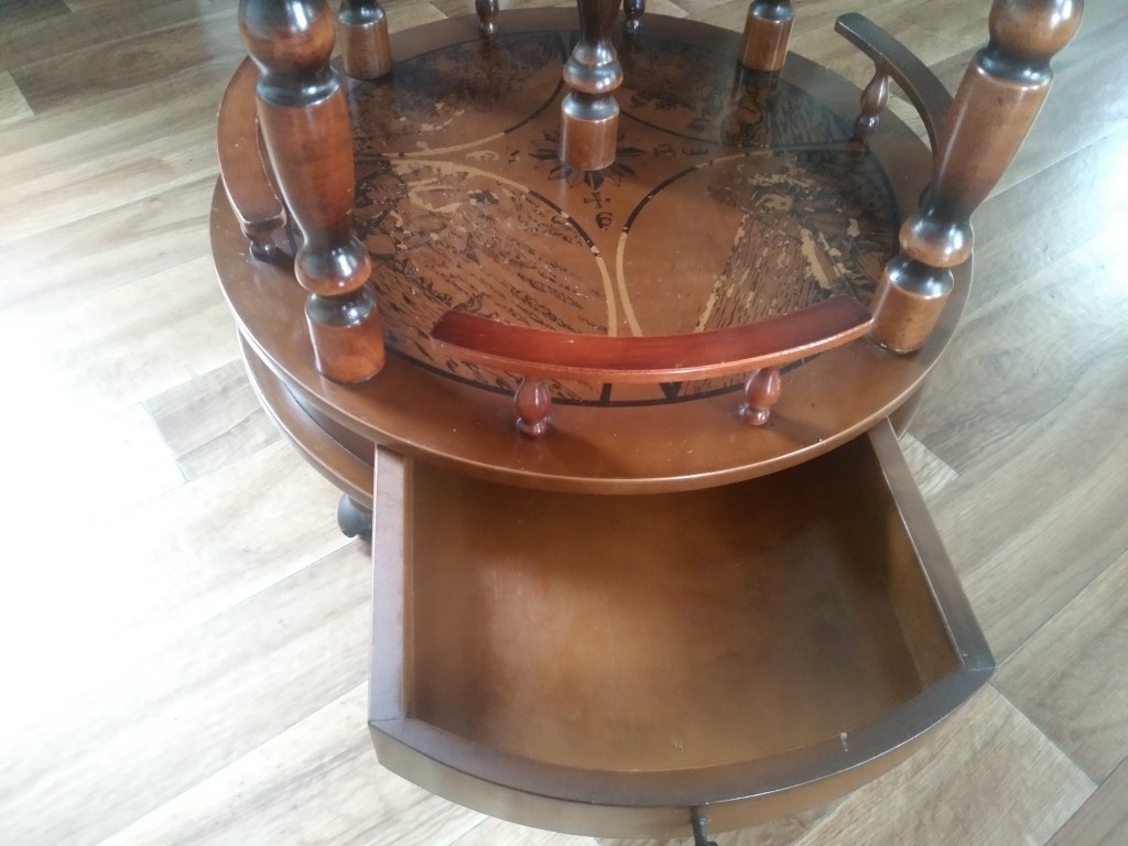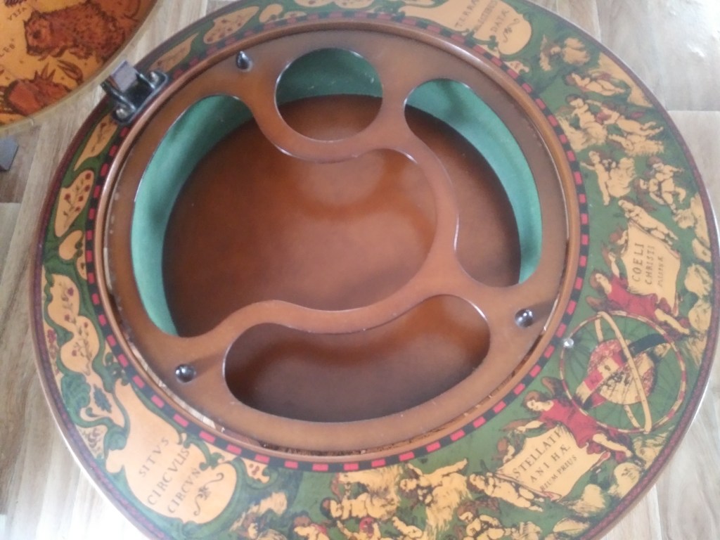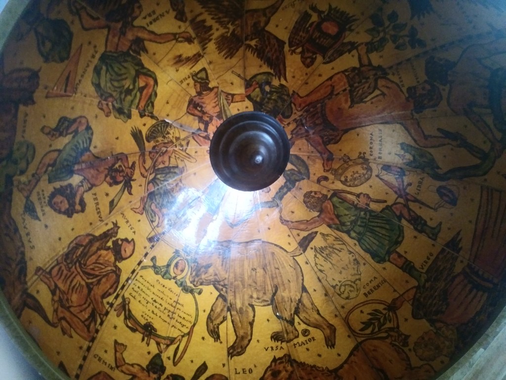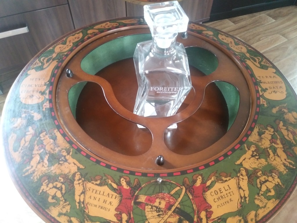 Podobno tego typu „glob-bar” wykonany jest z egzotycznego drewna. Niestety nie znalazłam informacji, z jakiego konkretnie. Barek pełni nie tylko funkcję użytkową, ale także dekoracyjną. Naniesione na niego mapy, przypominają te ze starych galeonów. Jest on celowo postarzany i pasuje nie tylko do stylu kolonialnego, ale i do nowoczesnych wnętrz. Dodatkowo cała „kula ziemska” kręci się, na dole jest dodatkowa półka na alkohole a także szufladka. Po otwarciu globu, wewnątrz, zobaczymy gwiazdozbiory 🙂 Nie jestem w 100% pewna, ale wydaje mi się, że napisy na mapach i w środku kuli, są po łacinie 🙂