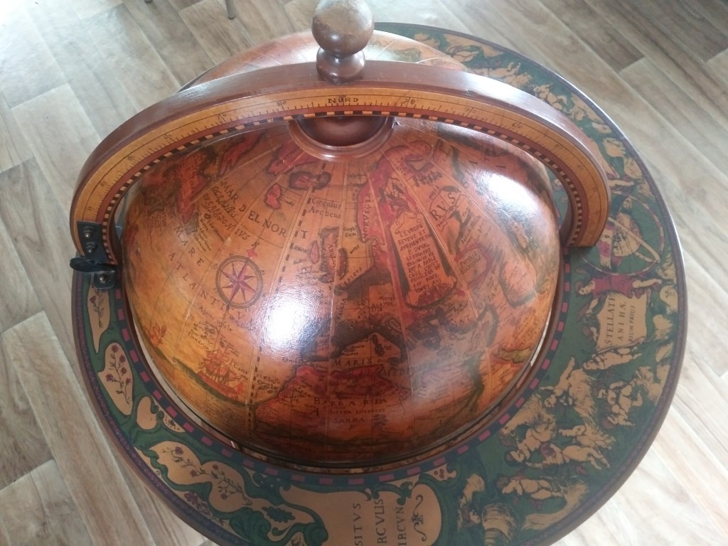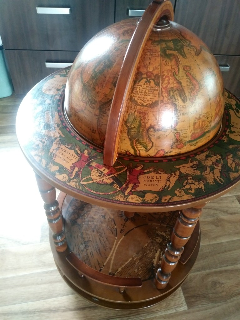 Pan Mąż powiedział kiedyś, że marzy mu się barek, taki na alkohol. I to ma być nie byle jaki barek. Ma to być barek- globus… No ok. Tylko z tego, co się orientuję, taki barek sporo kosztuje. No i skąd go wziąć…? Widziałam nie raz taki globus w holenderskim domu. W kringloopach i na pchlich targach, ani razu. No, ale od czego jest mój ulubiony marktplaats 🙂 Grzebałam, sprawdzałam, szukałam i bingo! Kilka ofert się wyświetliło. Wybrałam tę z Tilburga. Ogłoszenie dała jakaś pani. Napisałam. Zapytałam się, czy aktualne i czy można podjechać po niego w sobotę o godz. 12:00. Odpisała szybko, że tak i że za 100 euro może go sprzedać. Podała też adres. Czyli zero negocjacji. Pokazałam Panu Mężowi. Zgodził się i w weekend pojechaliśmy do Tilburga. O godz. 12:00 zadzwonilismy do drzwi. Otworzyła nam starsza pani. Powiedziałam po co przybyliśmy, zaprosiła nas do środka i pokazała globus. Wyglądał dokładnie, jak na zdjęciu, czyli ładnie 🙂 Stwierdziliśmy, a w zasadzie Pan Mąż stwierdził, że bierzemy. Pomogliśmy pani opróżnić barek- wyjęliśmy karafki i alkohol. I do auta 🙂