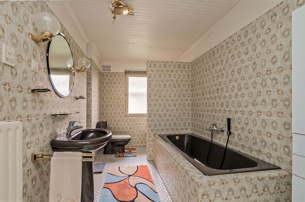 Ten brąz przypomina mi kolor wenge, który zresztą bardzo lubię, ale tutaj prezentuje się wg mnie strasznie. O ile płytki na ścianie jeszcze bym przęłknęła, tak wc, umywalka i wanna do wymiany. To już lepiej wyglądałyby w kolorze czarnym 😉