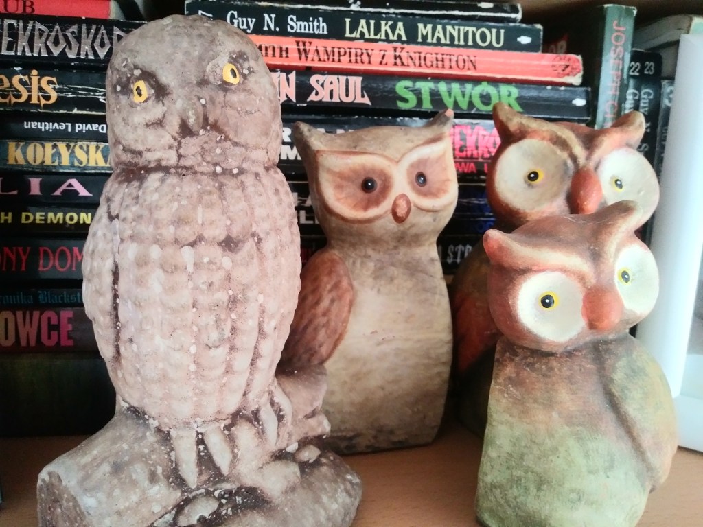 W kringloopie jest regał, na którym stoi różnej maści ptactwo. Najwięcej jest sów. Już mam 3 i stoją na półce z horrorami. Uważam, że one ogólnie pasują do książek 😁 Dziajaj wypatrzyłam jedną nietypową… Wygląd, jak z koszmaru 😂 Zrobiłam zdjęcie i poszłam dalej. W kolejce, przy kasie, stwierdziłam, że jeśli jej nie kupię, to będę żałowała. I poleciałam po nią. Od teraz stoi elegancko obok innych sówek i straszy 🙂