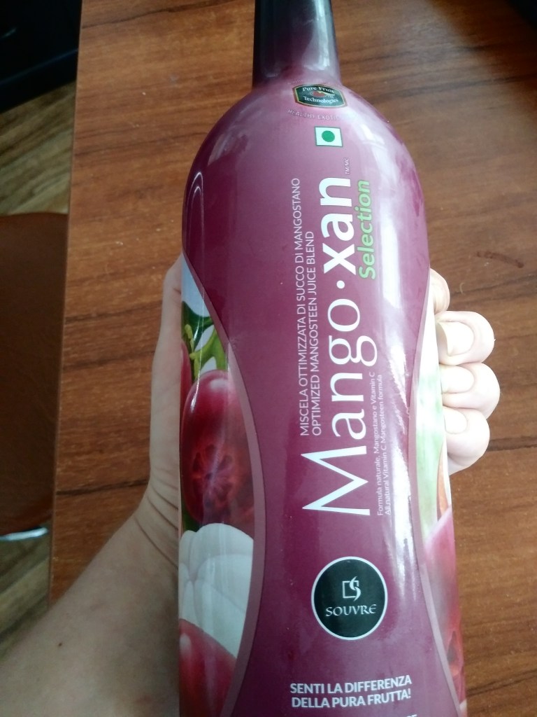 Ten sok, który my pijemy, jest firmy Souvre. W internetowych sklepach znaleźć można go bez problemu. W smaku jest lekko kwaskowy, czuć, że to napój owocowy, ale mi nie przypomina żadnego znanego owocu. Butelkę należy trzymać w lodówce, wstrząsnąć przed użyciem i wypić w ciągu 30 dni od daty otwarcia. Zawiera 100% naturalnego soku i wit C. Więc teraz, do zielonej herbaty i czystka, dołącza mangostan 🙂