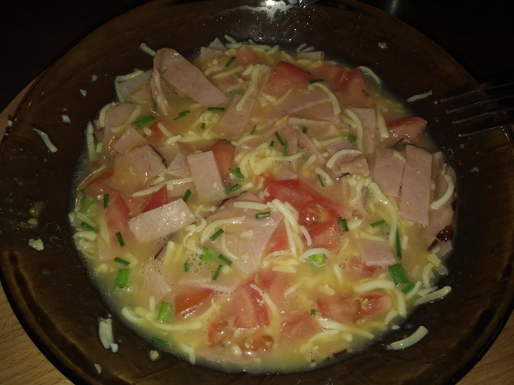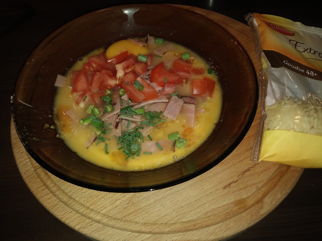 Omlet- nic odkrywczego, każdy pewnie jadł. Przy okazji smażenia ryby, zostało trochę jajek, więc zrobiłam omleta z kilkoma składnikami, bo same jajka to jakoś mi nie pasują. Nie dodaję nigdy mąki. Reszta składników, to tzw czyszczenie lodówki: jakaś wędlina, pomidor 🍅, szczypiorek, tarty żółty ser, sól. Wszystko wrzuciłam do jajek, wymieszałam i na patelnię. Wyszło jak zawsze, czyli bardzo dobre 😊🍳🍴