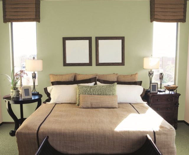 Pisałam wyżej, że ja akurat lubię spokojne i bezpieczniejsze kolory, np te oklepane beże i brązy. Poniżej zdjęcie znalezione w internetach: połączenie zielonych ścian z brązowymi dodatkami 🙂