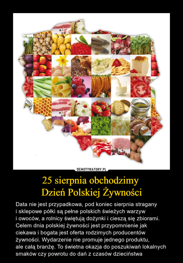 Inicjatorem tego święta są twórcy Ogólnopolskiego Programu Promocyjnego „Doceń polskie”. Przedsięwzięcie ma na celu propagowanie rodzimych artykułów spożywczych i ich twórców. Egzotyka chyba już nam się przejadła 😉 Od kiedy otworzyły się granice, Polacy zwiedzają świat i kosztują innych, często egzotycznych produktów. Ale na koniec i tak okazuje się, że nie ma jak polskie 🙂 Nasza żywność zyskała już dawno uznanie nas samych, a także jest doceniana na całym świecie 🙂 Z badań wynika, że do najpopularniejszych polskich produktów należą: wędliny, pieczywo i sery. Na stronie Ministerstwa Rolnictwa i Rozwoju Wsi znajduje się lista, na której jest 1919 tradycyjnych produktów, np : dolnośląski twaróg sudecki, kujawski groch z kapustą, lubelskie miody, łódzka kiełbasa chłopska, małopolski oscypek, opolska rolada wołowa, kaszanka po kaszubsku, czy śledzik kołobrzeski.