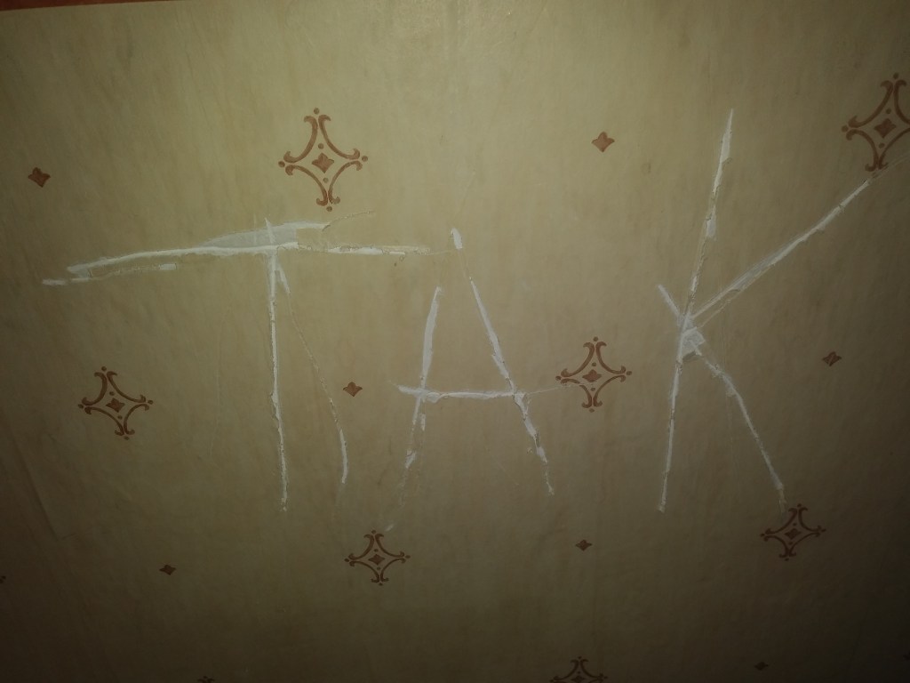 A tu chyba jakieś oświadczyny się odbyły. On poprosił ją o rękę a ona wyryła w tapecie odpowiedź. Wcześniej zastanawiała się ze 2 dni. Potem zrobiła napis i kazała mu go znaleźć. Ot, taka historyjka mi się nasunęła 😅 Dobrze, że te tapety brzydkie i wszystko będzie zrywane.