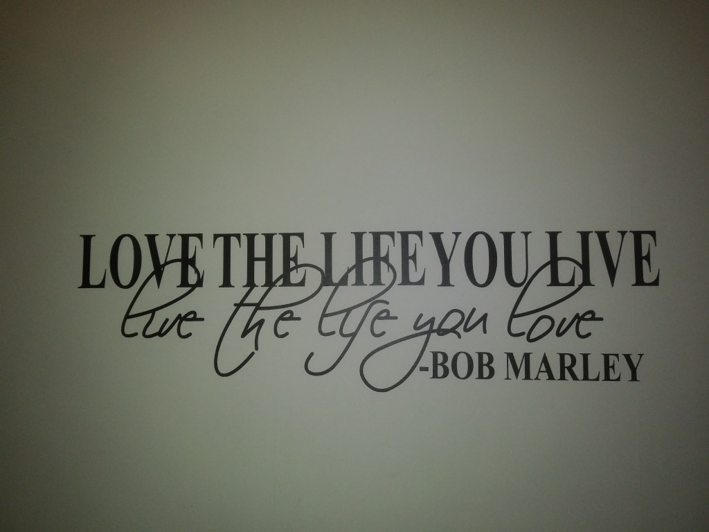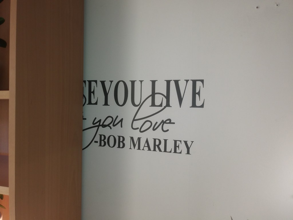 Napis na ścianie. Ładny cytat, zresztą Boba Marleya lubię, ale nie jestem zwolenniczką liter na ścianie. Nie podobają mi się takie naklejki z różnymi maksymami, czy obrazkami. Wiem, że to modne i że Holendrzy je sobie upodobali, ale ja jestem na nie. Gdybym już musiała zgodzić się na takie coś, to tylko napis: hakuna matata 😁