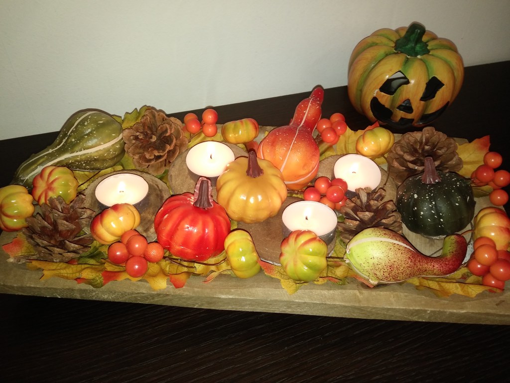 W Actionie były także dekoracje jesienne. Do tego na równi z tymi na Halloween 🎃 i Boże Narodzenie 😄 Dwa tygodnie temu, kupiłam drewnianą tacę+ sztuczne liście i plastikowe dynie. Nie lubię plastiku, a te ozdoby to w sumie takie byle gówno, ale trudno, niech będą. Dobrze, że szyszki są naturalne i małe plastry drewna. Dodałam parę wkładów i w domu też ciut jesiennie 🙂