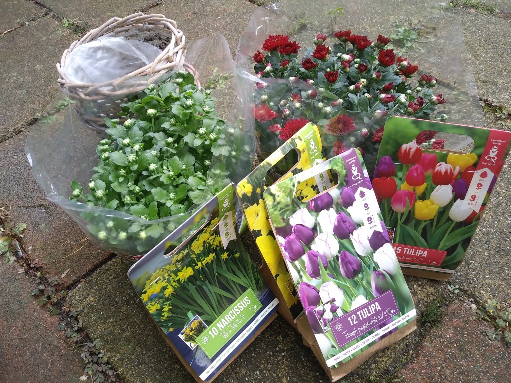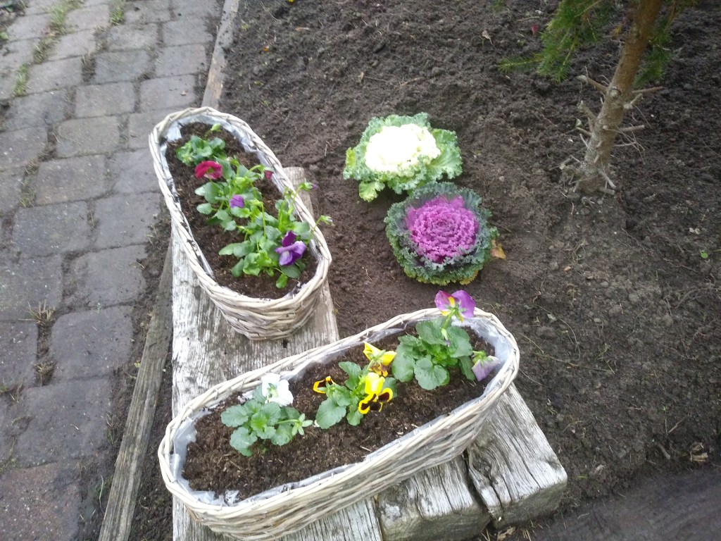 Była promocja na bratki: 10 sztuk za 4 euro! No trzeba było wziąć 🙂 Do tego dwie sztuki ozdobnych kapustek, cebulki tulipanów i żonkili. Jedne tulipany wzięłam czarne, bo zawsze takie chciałam. Reszta jest różnokolorowa. Posadzone na jesień, powinny na wiosnę wyrosnąć.