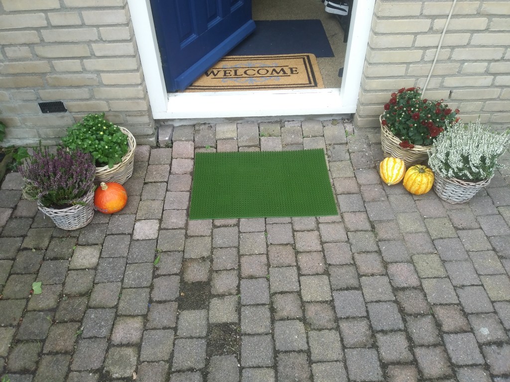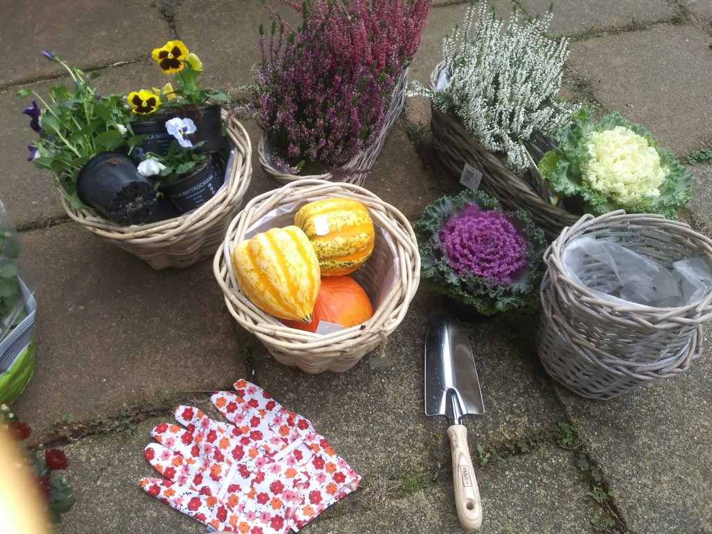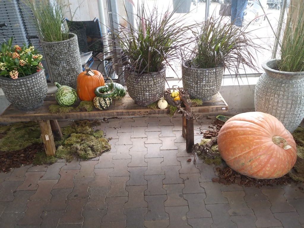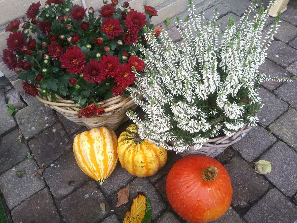 Ja oczywiście oczopląsu tam dostawałam, bo roślin i dekoracji jesiennych ogrom. Ogólnie potrzebowaliśmy jakieś grabki do liści i szczote do zamiatania chodnika. Myślałam też o wrzosie i chryzantemach. Zakupiłam też dwa plecione koszyczki, żeby te wrzosy jakoś się prezentowały. Chryzantemy wsadziłam do koszyków kupionych w kringloopie. Do tego trzy małe dynie i przed domem jest jesiennie 🍂🍁😊