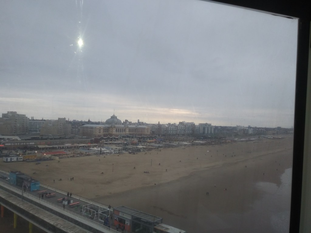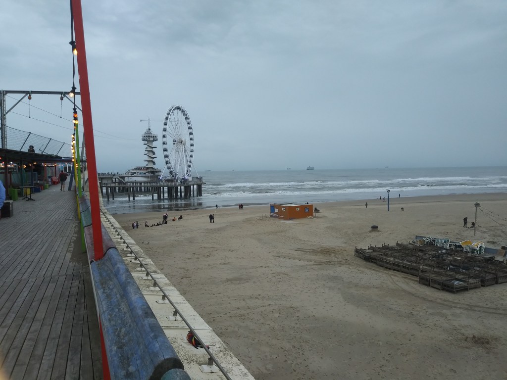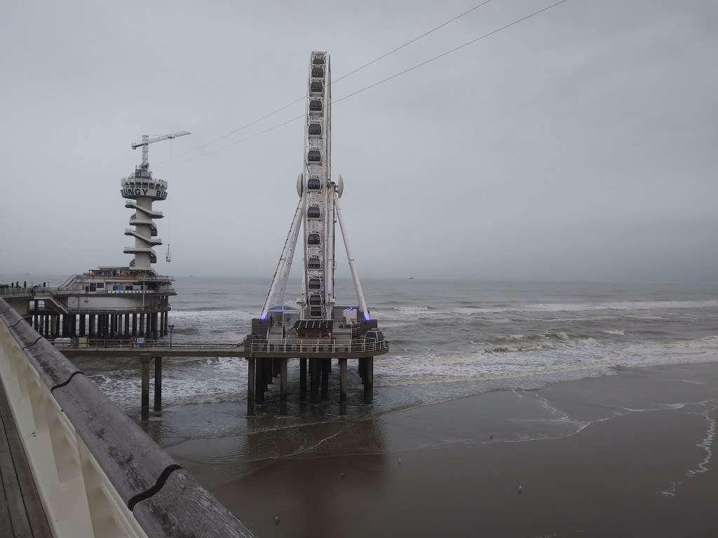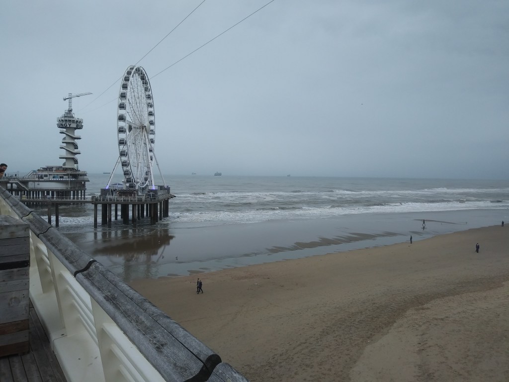 Po wyjściu z tego przeklętego koła, udaliśmy się dołem na plażę. Pan Mąż kupił gofra, bo mu pachniało 😀 I znowu przekonałam się, że holenderskie plaże są piękne i szerokie. Morze było wzburzone i wyglądało cudnie 😍🌊 W wodzie było sporo surferów. Ludzie nawet w kurtkach chodzili boso i miałam ochotę zrobić to samo 😊 Do hotelu od strony plaży, blisko nie podchodziliśmy. Wolałam gapić się na fale, mewy i muszle 🐚Chcemy tu przyjechać, gdy będzie ciepło i bezchmurnie, bo podobno zachody słońca są tu piękne 🌅