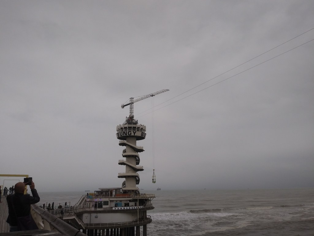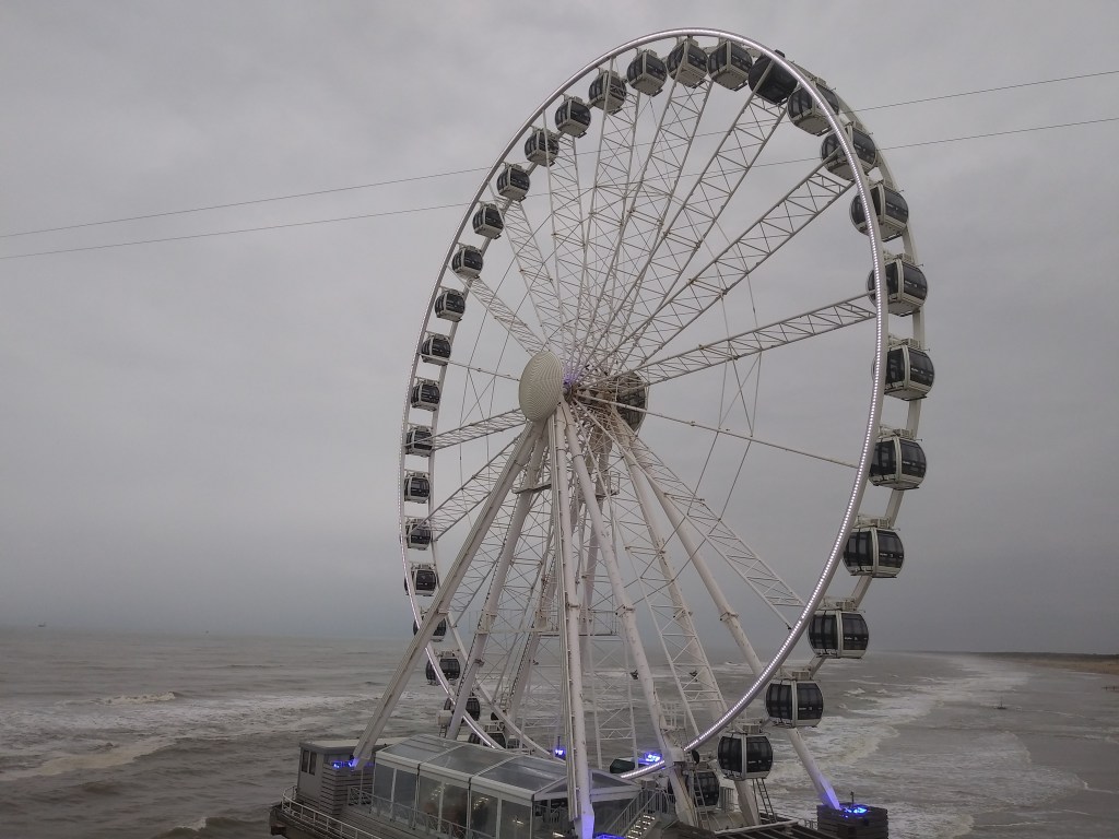 Po drodze stwierdziliśmy, że zrobimy sobie jazdę na diabelskim młynie. Pamiętam, że będąc w Trójmieście, jeździliśmy na takim w Gdyni i widok na port był super 🙂 Doszliśmy do końca mola, gdzie są dwa zejścia na dół: jedno do wieży widokowej ze skokami i drugie do koła. Bilet: 9€. W Gdyni zapłaciliśmy 50zl od osoby, ale to był sezon letni. I tu muszę napisać, że żałowałam, że w ogóle wlazłam do tej kabiny na młynie. Jak w Gdyni był dzień słoneczny i bezwietrzny, tak tu zachmurzony i na plaży wiało. Co za tym idzie? Bujało nami i niemal zeszłam na zawał 😳😬😵 Prawie oczu nie otwieralam i z samego szczytu plaży i morza nie widziałam. Czekałam, aż wreszcie się to ustrojstwo zatrzyma. A obrotów było chyba ze 4!