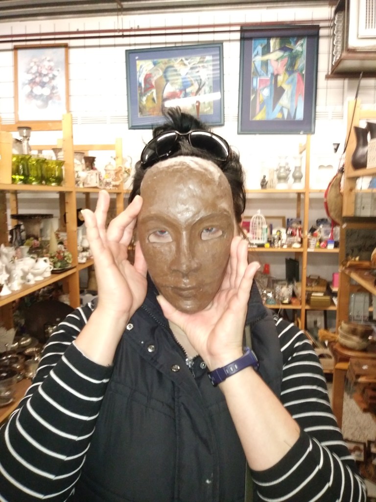 Zawsze oglądam też drewniane ozdoby, jak np afrykańskie maski, zwierzęta czy naczynia. Bardzo mi się podobają, bo pasują do stylu kolonialnego 😊 Ale nawet w kringloopie są pieruńsko drogie. Jedną taką maskę przyłożyłam do twarzy, jak w filmie „The Mask” 🎭😂
