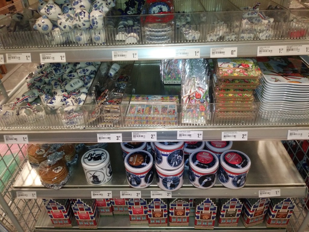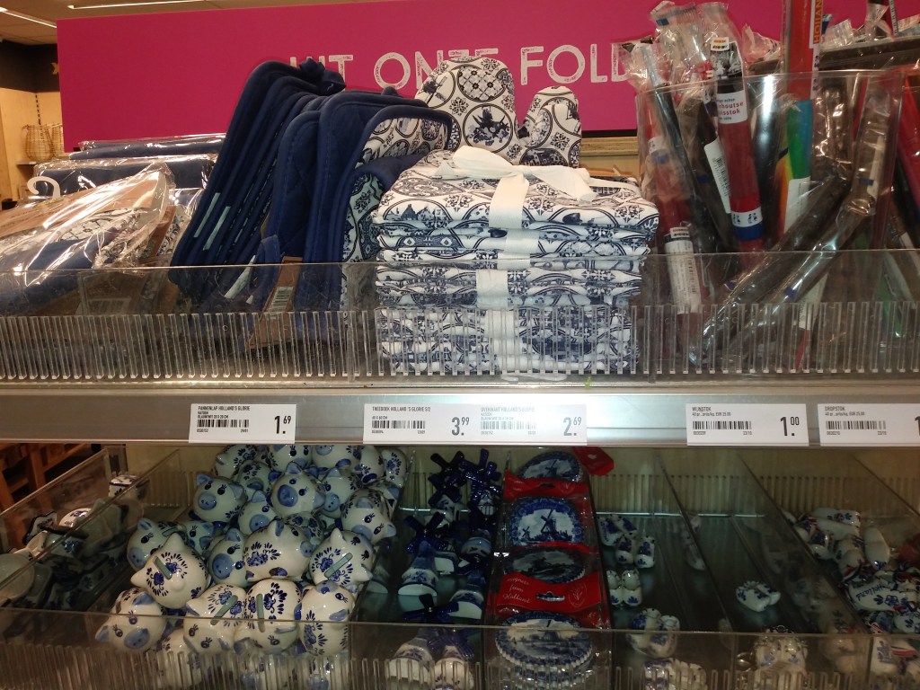 I jeszcze regał z fajnymi gadżetami w holenderskie motywy 😀 Kupiłam rękawicę kuchenną w niebieskie wiatraki. Są to rzeczy, które warto kupić na pamiątkę.
