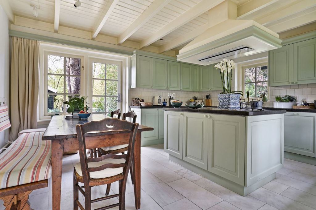 Kuchnia także ma porządny metraż. Jest na tyle duża, że mieści się w niej wyspa i stół z krzesłami i ławą. Pistacjowy kolor i okna nadają lekkości i nie przytłacza to pomieszczenia, mimo tylu mebli.