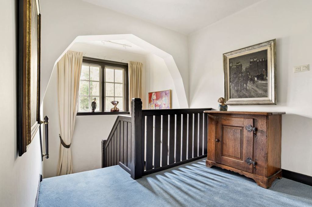 Schody są szerokie ze świetną drewnianą poreczą. Do tego okno z zasłonami i niewielka komoda z obrazem 🙂