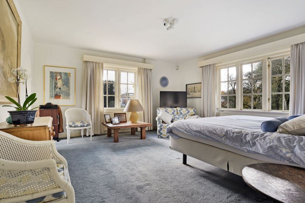 Sypialnia takich rozmiarów, to marzenie pewnie wielu ludzi 🙂 Jest miejsce na ogromne łóżko i nawet szafę. Z tym, że tutaj tej szafy nie ma. Są za to dwa duże (a jakże) okna, fotele a nawet mała kanapa.