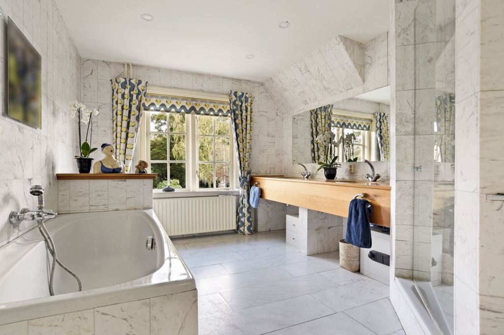 Łazienka duuuża 🙂 Mieści się w niej i wanna i prysznic. Wszystko w jasnych płytkach, co jeszcze bardziej powiększa przestrzeń. Na uwagę zasługują dwie umywalki zabudowane w drewnie- jasnym. W łazienkach zazwyczaj są małe okienka. Tu: wielkie z zasłonami 🙂