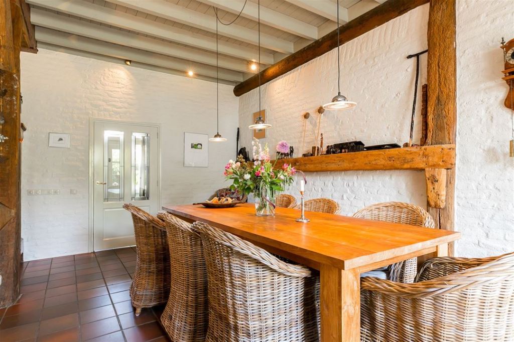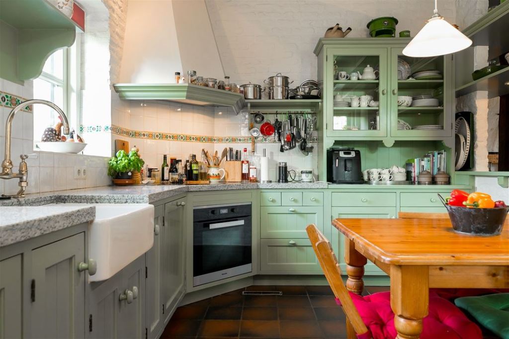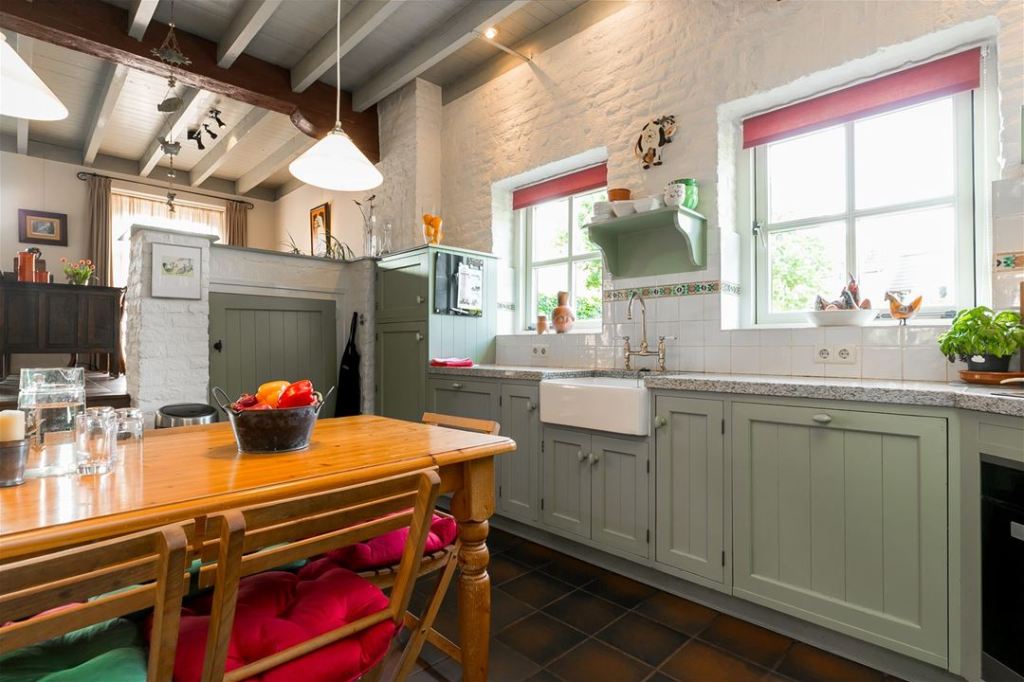 Kuchnia też bardzo mi się podoba 🙂 Jest na tyle duża, że mieści się w niej spory stół z krzesłami. Fantastyczne okna i szafki kuchenne+ stylowy okap i zlew vintage, który jest teraz szalenie modny. Ja bym oczywiście zrobiła dwie rzeczy po swojemu: w oknach delikatne, krótkie firanki i inny kolor mebli. Holendrzy się kolorów nie boją, więc nie dziwi mnie tutaj pistacjowy.