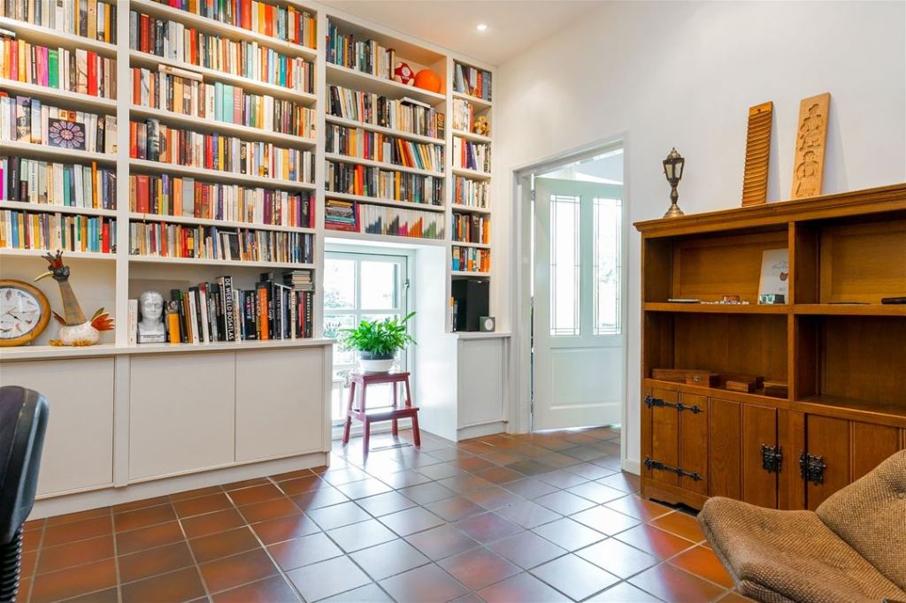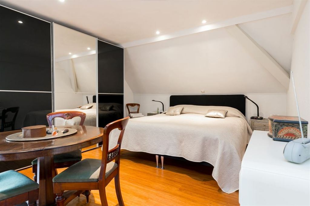 Jedna z sypialni. Piszę jedna, bo ta wydała mi się najciekawsza, a jest ich w tym domu kilka. Tu nowoczesna przesuwana szafa miesza się z okrągłym retro stolikiem kawowym. Łóżko należy raczej do tych nowoczesnych, ale z tego, co widzę, szafki nocne, już nie. Widać też białą komodę, a na niej puszki vintage i radyjko chyba w stylu retro 🙂