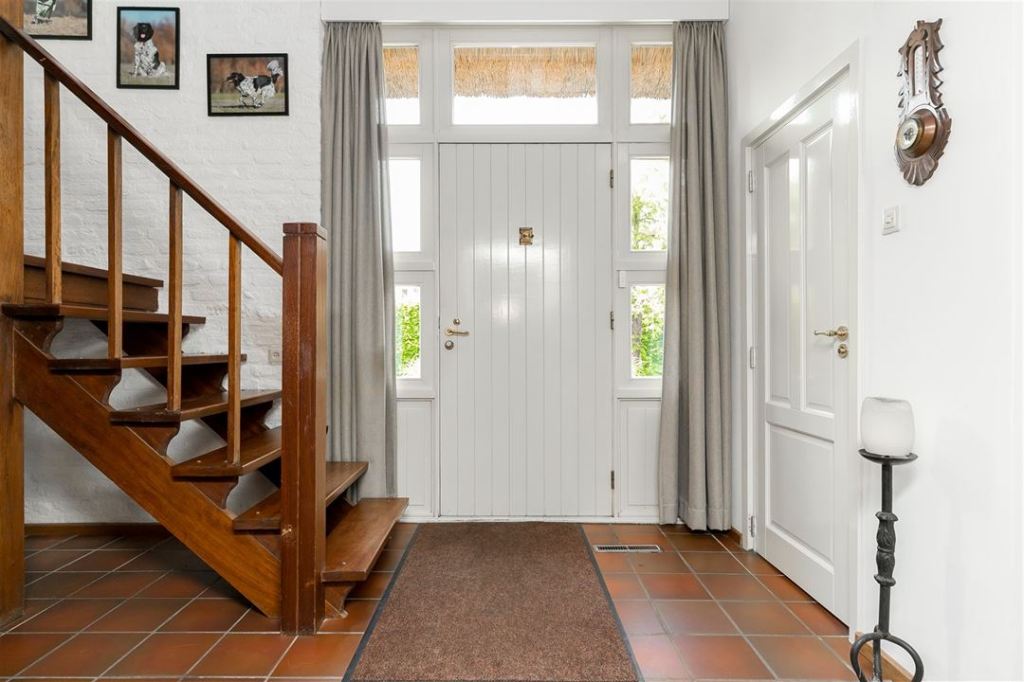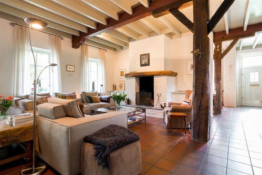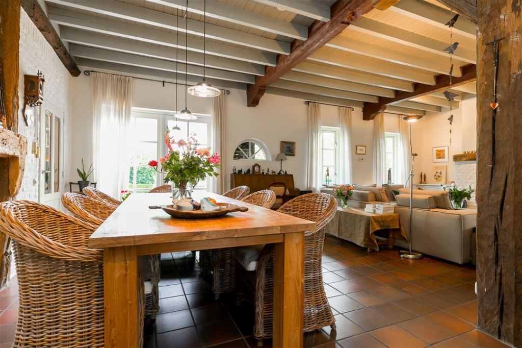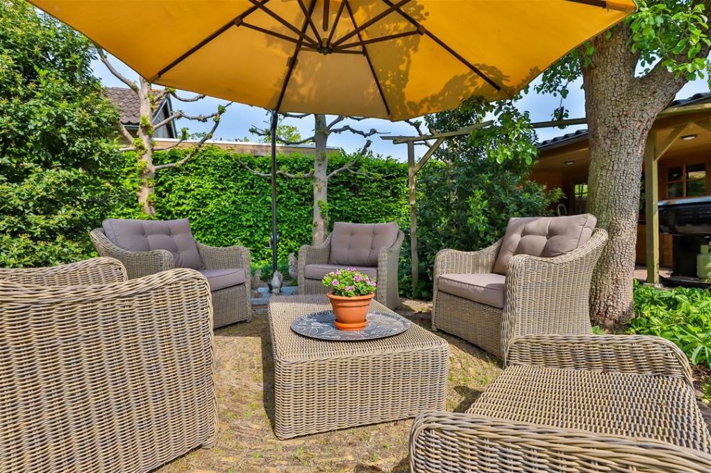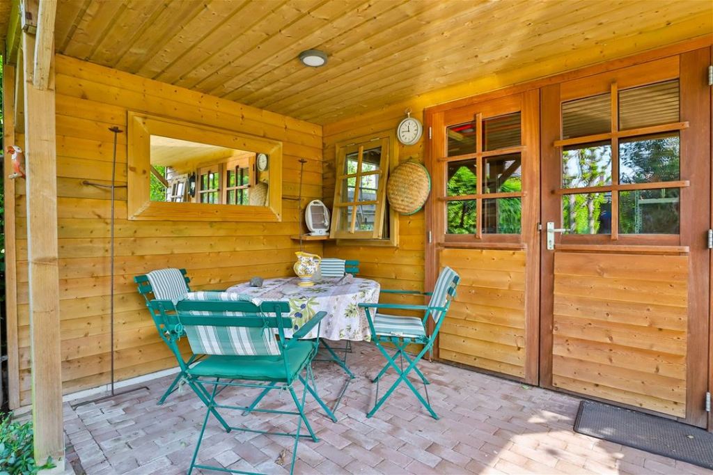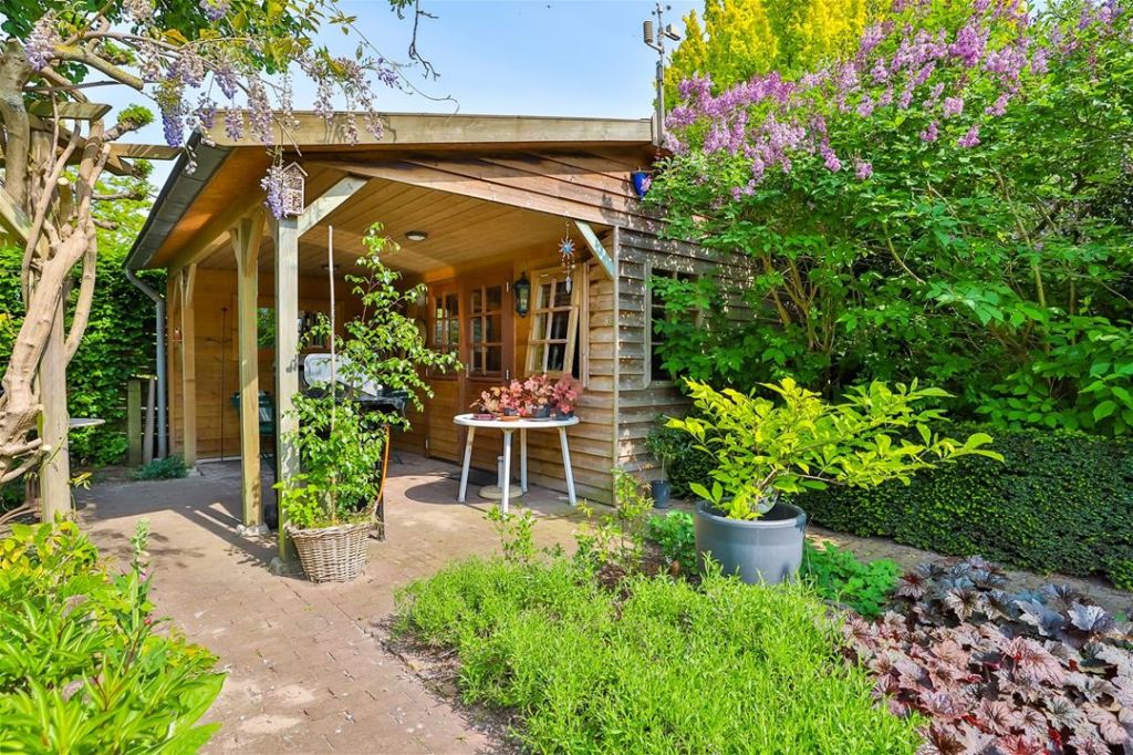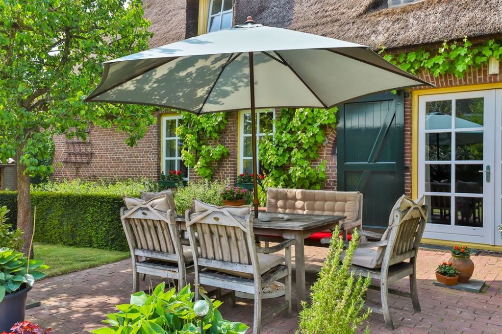 Wiadomo: tuinhuis, czyli domek ogrodowy musi być 🙂 Ten jest naprawdę sporych rozmiarów, posiada zadaszenie, pod którym stoi mały stolik z krzesłami. Bezpośrednio przed domem, znajdują się dwa zestawy wypoczynkowe: jeden drewniany z dużym stołem a drugi rattanowy, obydwa z wielkimi parasolami. Wsystko otoczone zielenią: drzewa, krzewy, kwiaty, winorośl 🙂