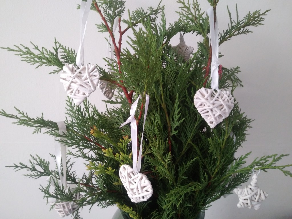 Na regałach stało sporo koszyków z drobnymi ozdobami, typu wstążki, szyszki, czy drewniane choinki na sznurkach. Ja znalazłam w torebce plecione serca i dwie gwiazdki. Kosztowało to 50 centów. Wzięłam, bo pomyślałam, że zawiesze je na tych gałęziach cyprysa, które z pracy przywlekłam. To nie bombki, więc mogą już wisieć 😁
