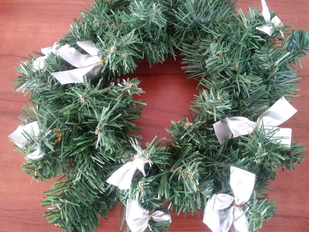 Do tego wieniec ze srebrnymi kokardkami, który będzie powieszony na zewnątrz na drzwiach. Dodam do niego potem więcej ozdób.