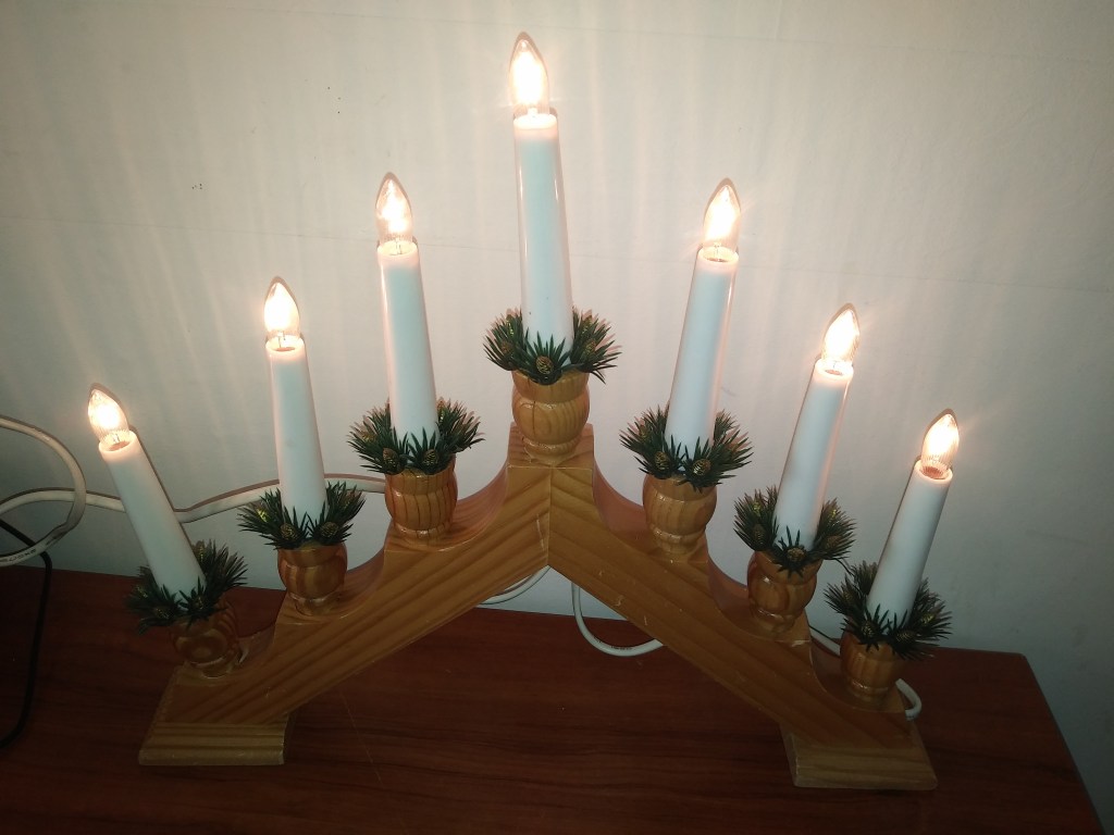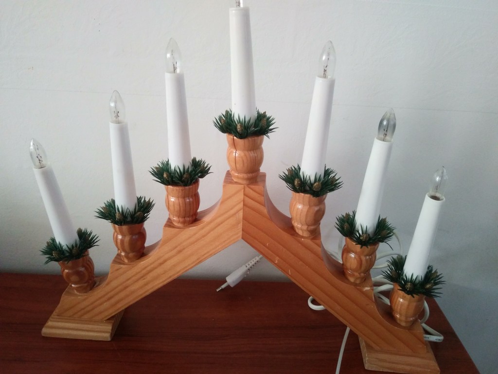 Ja kupiłam drewniany świecznik ze światełkami, który mam zamiar postawić na święta w kuchennym oknie 🙂 Były też plastikowe białe i czerwone. Wybór padł oczywiście na drewno.