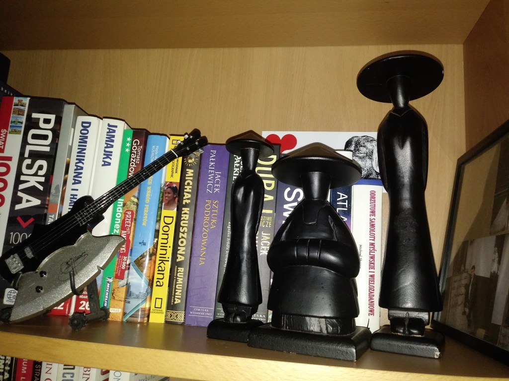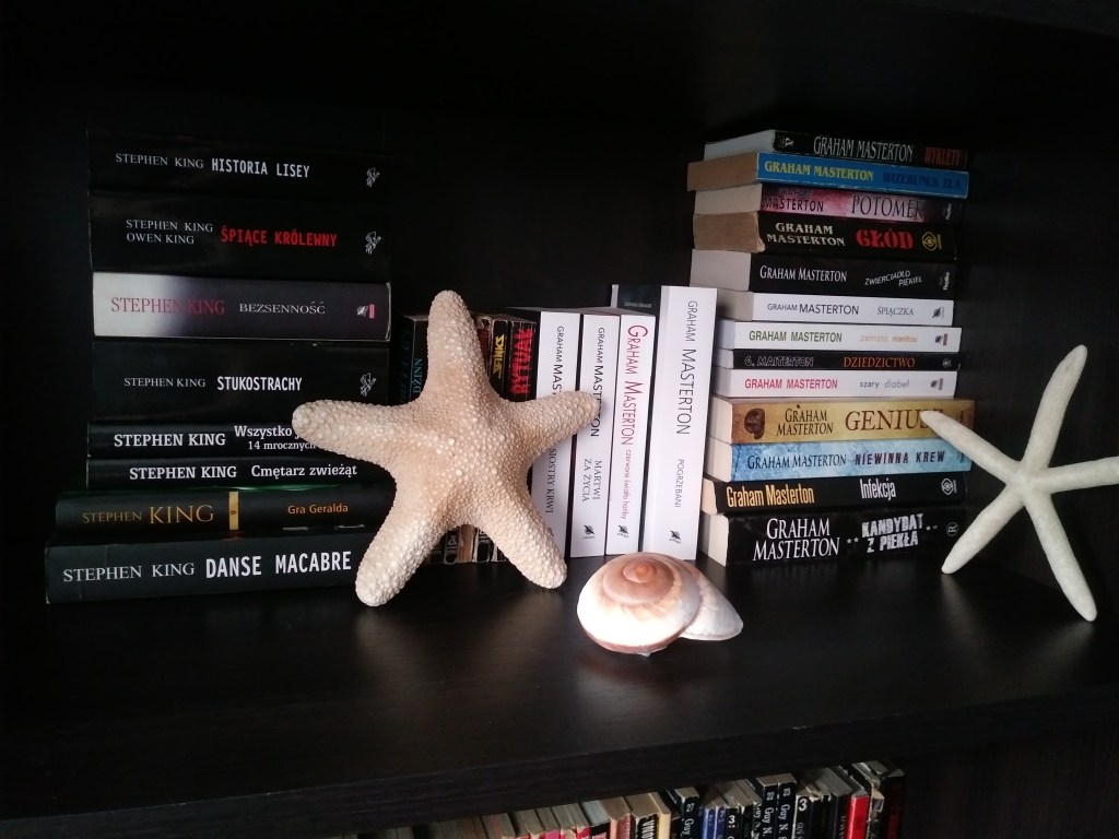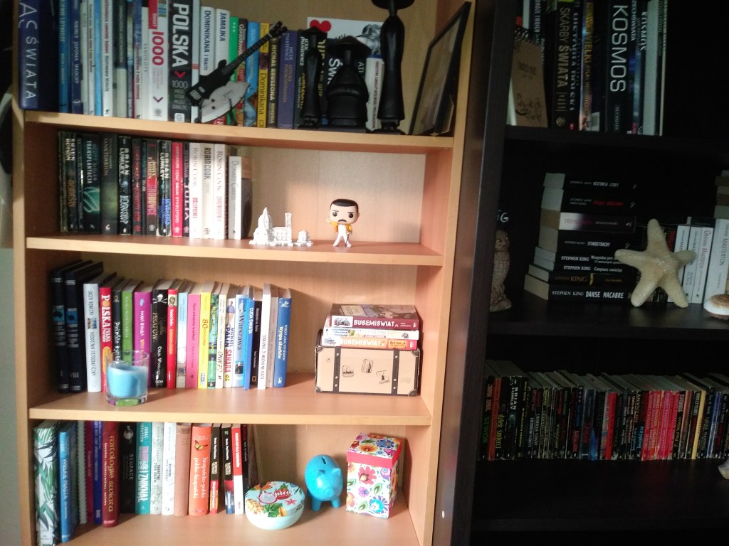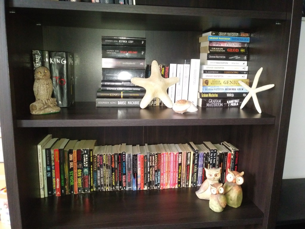 Na nowych półkach postawiłam swoje ulubione horrory razem z sowami i muszlami, oczywiście też z kringloopa. Reszta półek czeka na uzupełnienie 🙂
