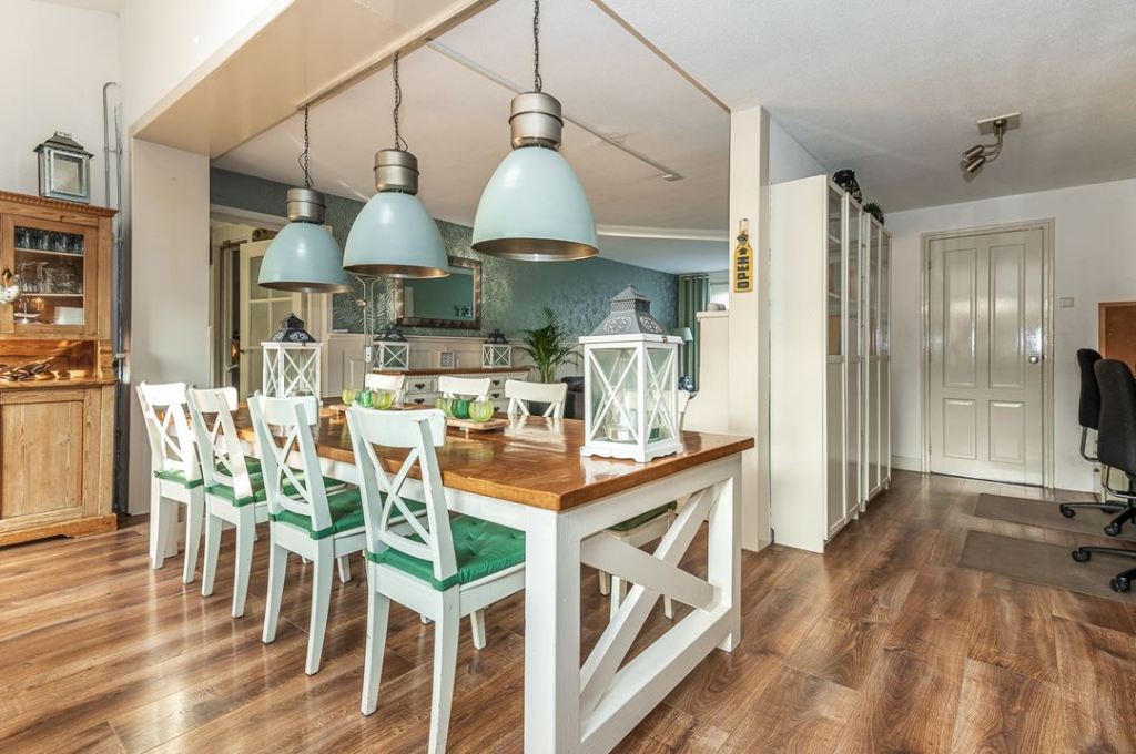 Duży drewniany stół z drewnianymi prostymi krzesłami. Ten tu jest super. Tylko kolor bym zmieniła 😉 Krzesła jak dla mnie, ciut za ciężkie, ale ogólnie całość prezentuje się fajnie. I te lampiony na blacie 😍 Mniej więcej tego będę szukać 🙂