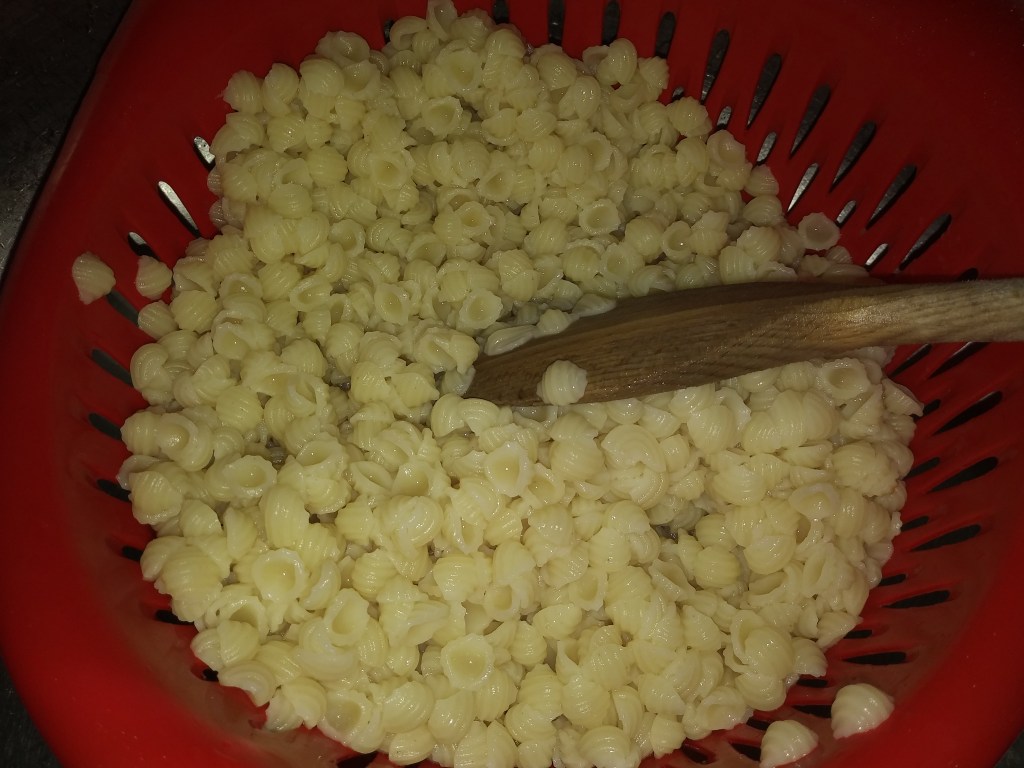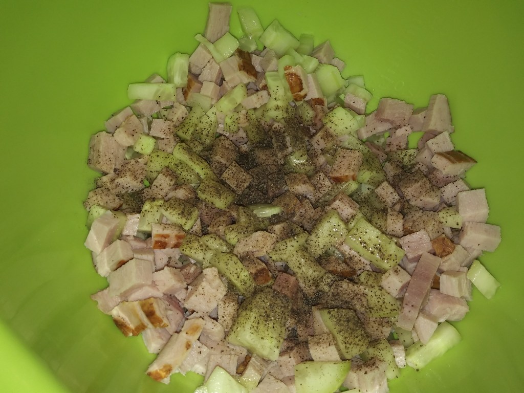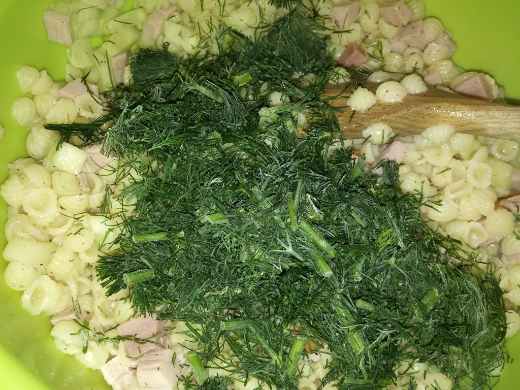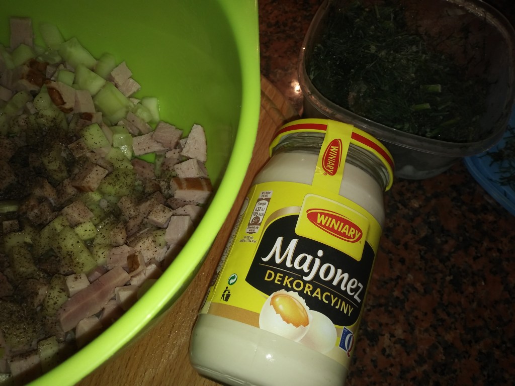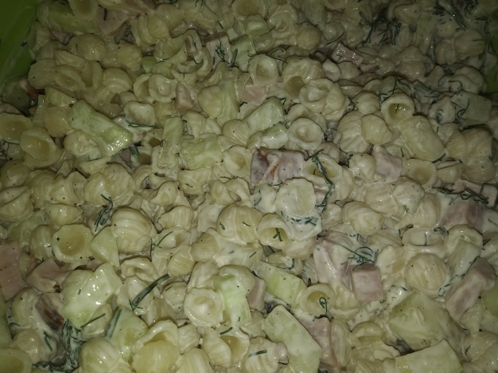 Moja ulubiona sałatka ma tylko 5 składników+ sól i pieprz 🙂 Robi się ją bardzo szybko, mimo że trzeba ugotować makaron. A że do niej potrzeba tego drobniutkiego, więc jest to chwila moment. W oryginalnym przepisie jest to makaron orzo (w kształcie ziarenek ryżu), ale jeśli takiego nie mam akurat, to pasują też malutkie muszelki lub kółeczka. Ja do tej dodałam muszelki. Pilnuje, żeby go nie rozgotować, bo w połączeniu z resztą składników wyjdzie paćka. Oprócz tego: ogórek świeży pokrojony w drobną kostkę, wędlina drobiowa (jeśli nie ma, to może być np polędwica sopocka, czy inna szynka) także pokrojona w kostkę, majonez i koperek. Zielenina może być świeża albo mrożona. Suchy koper nie ma wg mnie takiego aromatu i on ginie w tej sałatce. A zapach i smak koperku jest tu akurat dla mnie najważniejszy 🙂 Uwielbiam go, a za dzieciaka nie cierpiałam. Tak samo mam z kaszą gryczaną. Człowiek, to nie wiedział co dobre 😅 I wszystkie składniki połączyć trzeba z makaronem (nie czekam aż ostygnie, przelewam zimną wodą), dodać majonez, sól pieprz i wymieszać. Potem do lodówki i po godzinie można jeść 😊 Ja tę sałatkę robię zawsze wieczorem i na drugi dzień biorę do pracy. Pycha!