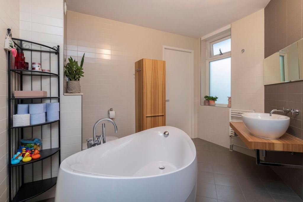 Łazienka jest naprawdę duża, bo mieści się w niej i prysznic i wanna, która jest ładna, bo wolnostojąca. Kolory także fajne. Dodatkowo zwykłe proste metalowe półki i jedna drewniana szafka 🙂