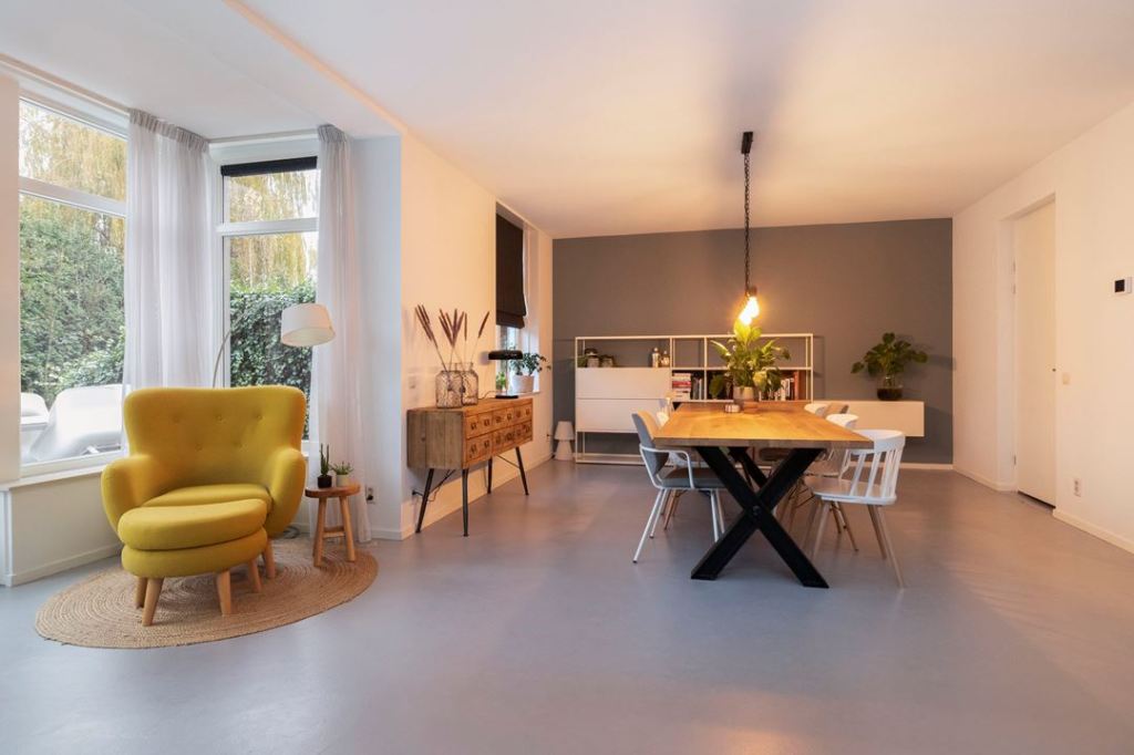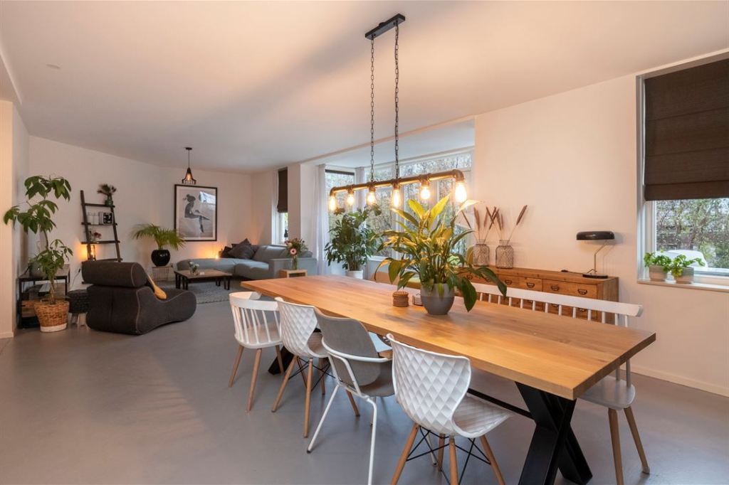 Jadalnia połączona z salonem: duży ładny stół i różne krzesła. Mnie w oko wpadła biała a la ławka z oparciem i piękny fotel uszak z podnóżkiem 🙂